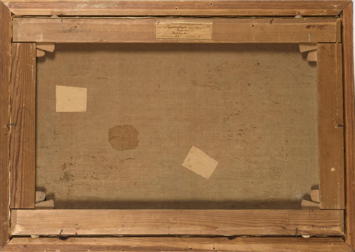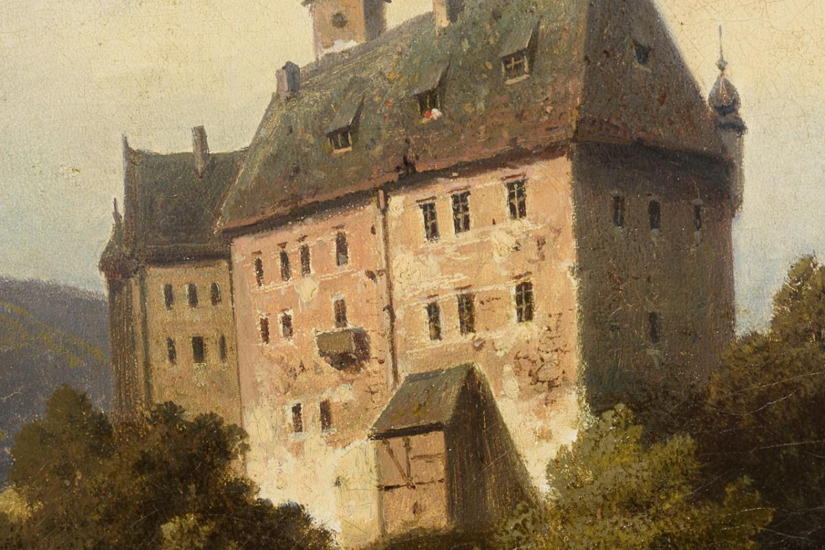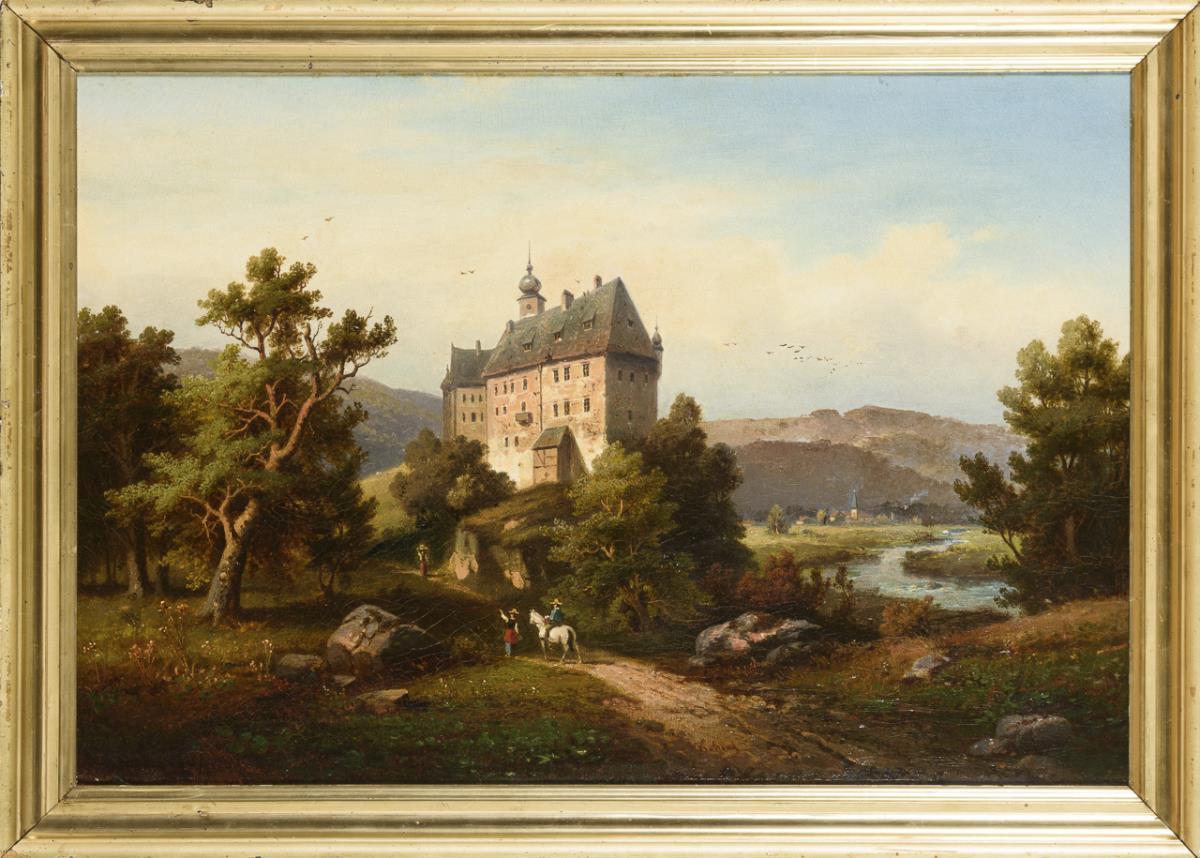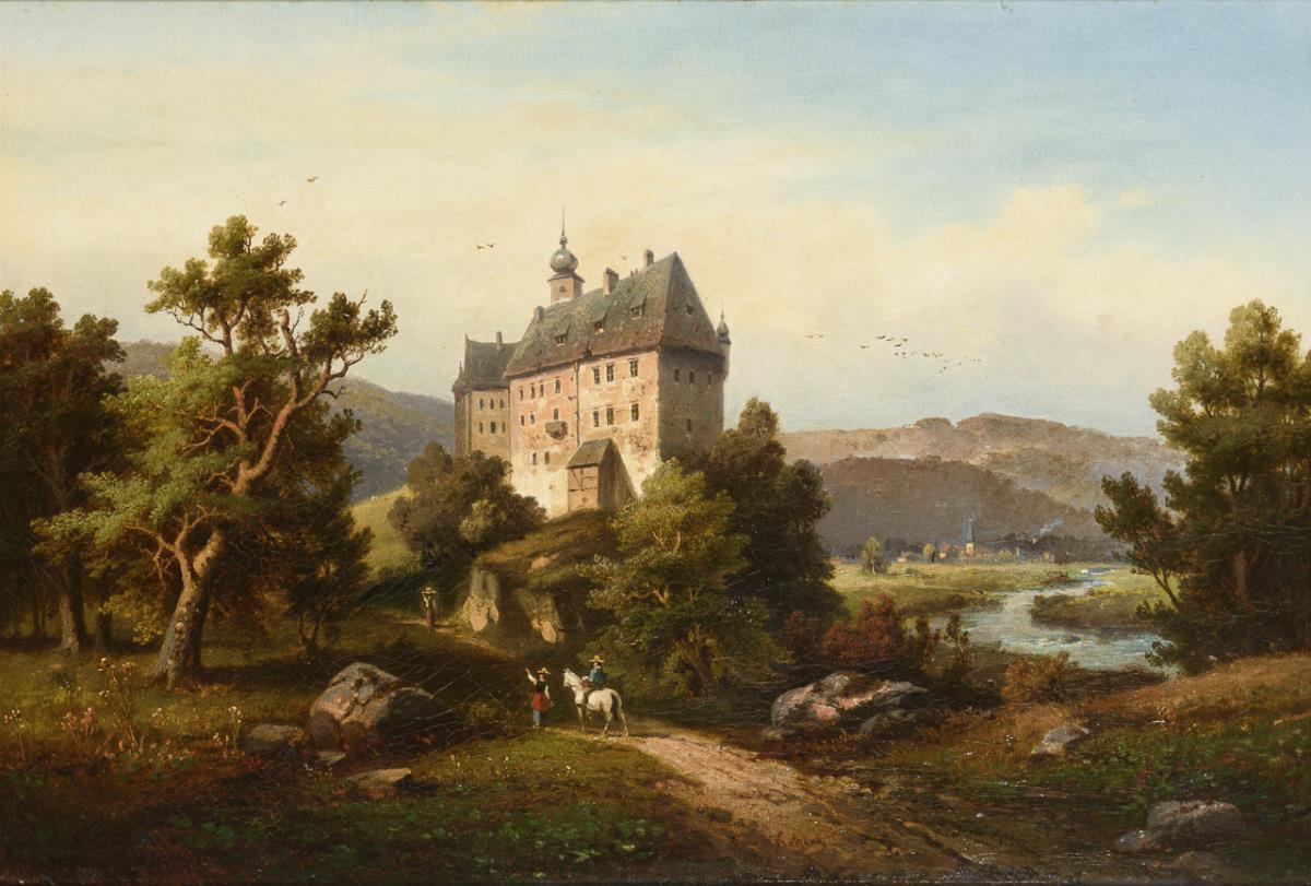 Romantische Landschaft mit Staffagefiguren vor dem Schloss. Restauriert mit zwei Hinterklebungen.