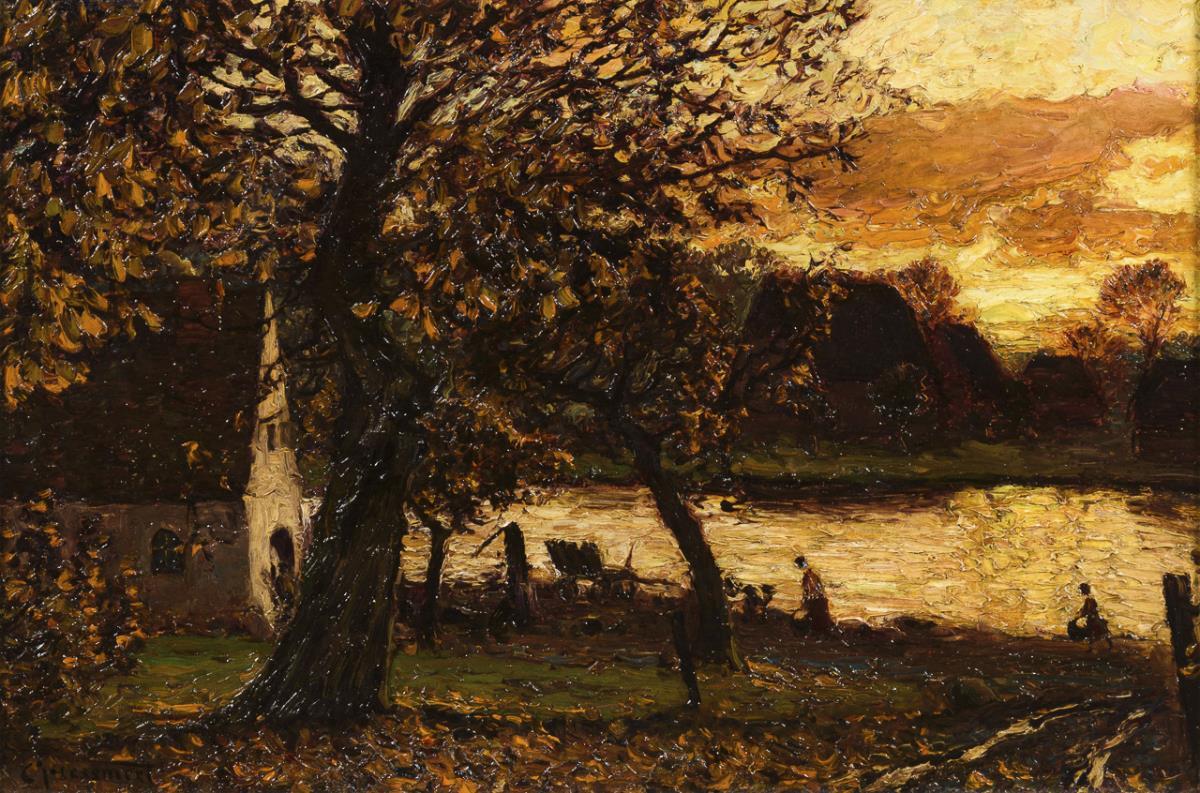 Pastos gemalte Flusslandschaft mit Staffagefiguren nahe dem Ufer und dem Haus in der Abendsonne.