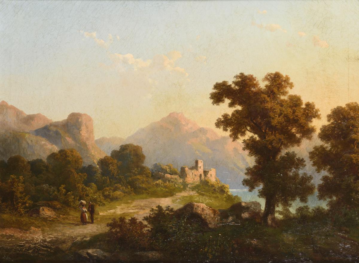 Staffagefiguren im idyllischen Licht nahe einer Burgruine oberhalb eines Sees. Altersspuren.
