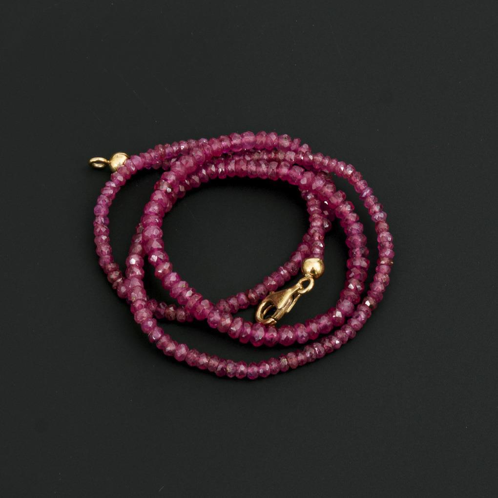 Schnürkette mit facettierten, kleinen Rubinscheiben in leichtem Verlauf, an Karabinerschließe.