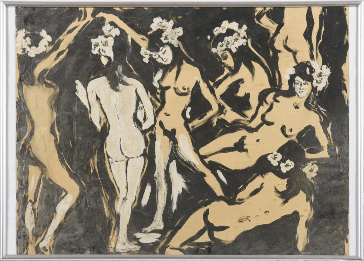 Tanzende nackte Frauen mit Blumen im Haar. Leichte Knicke und ein Riss.