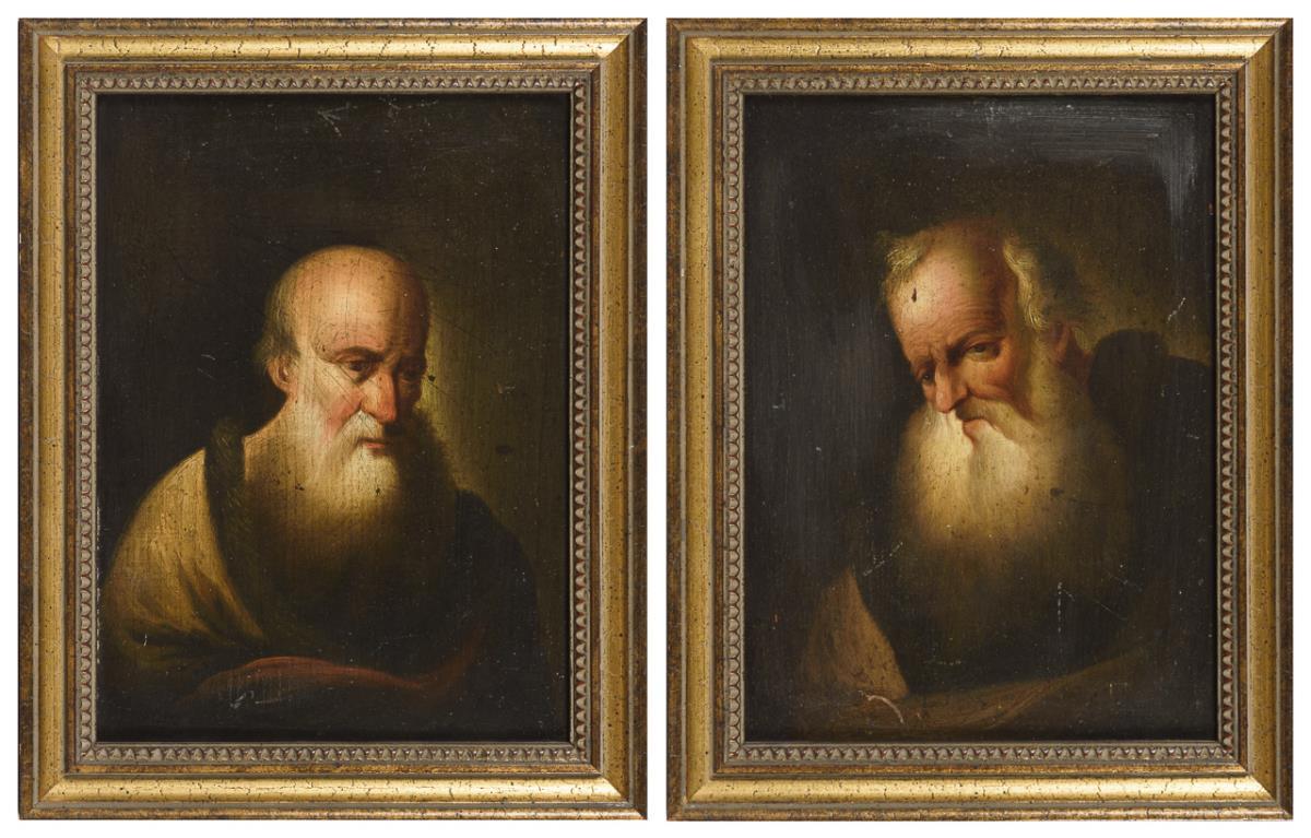 Charakterbildnisse zweier alter Männer mit langen Bärten vor neutralem Hintergrund. Je Altersspuren.