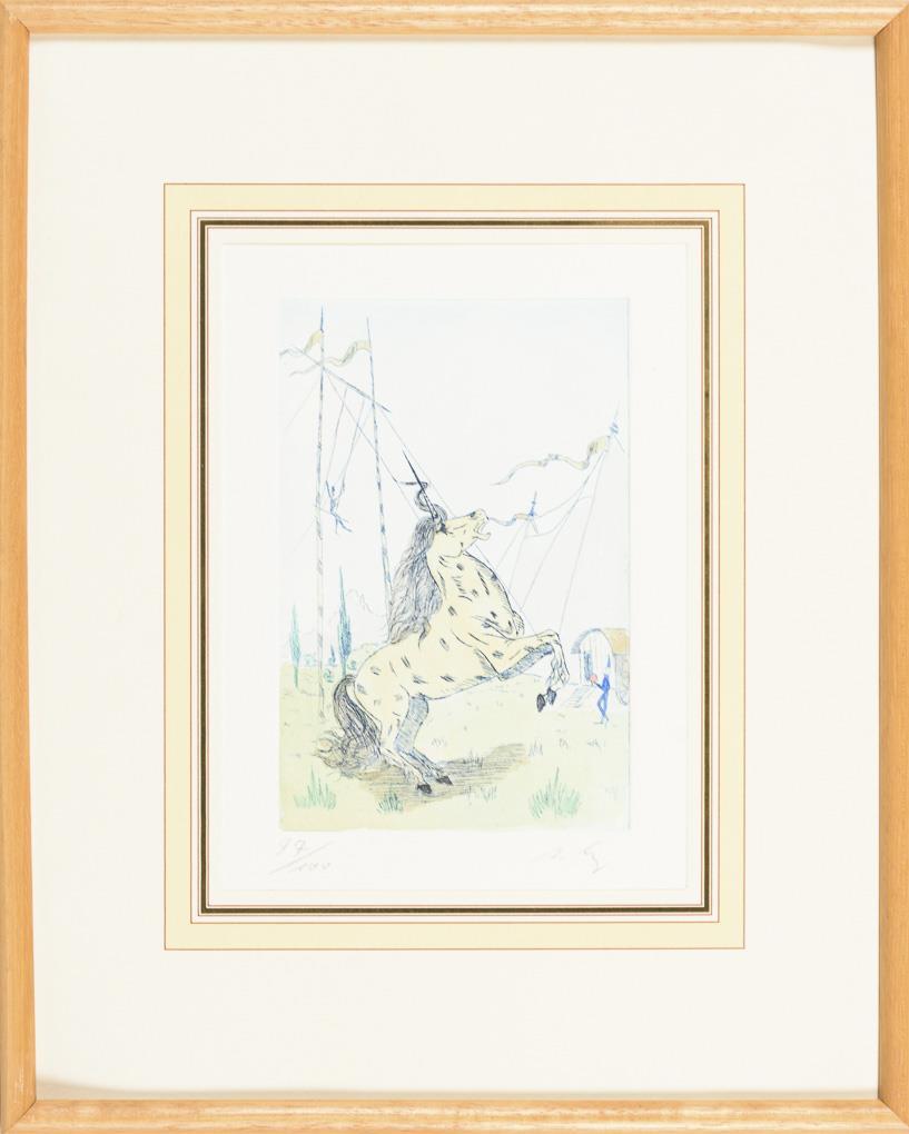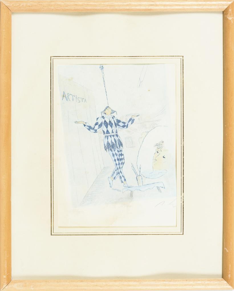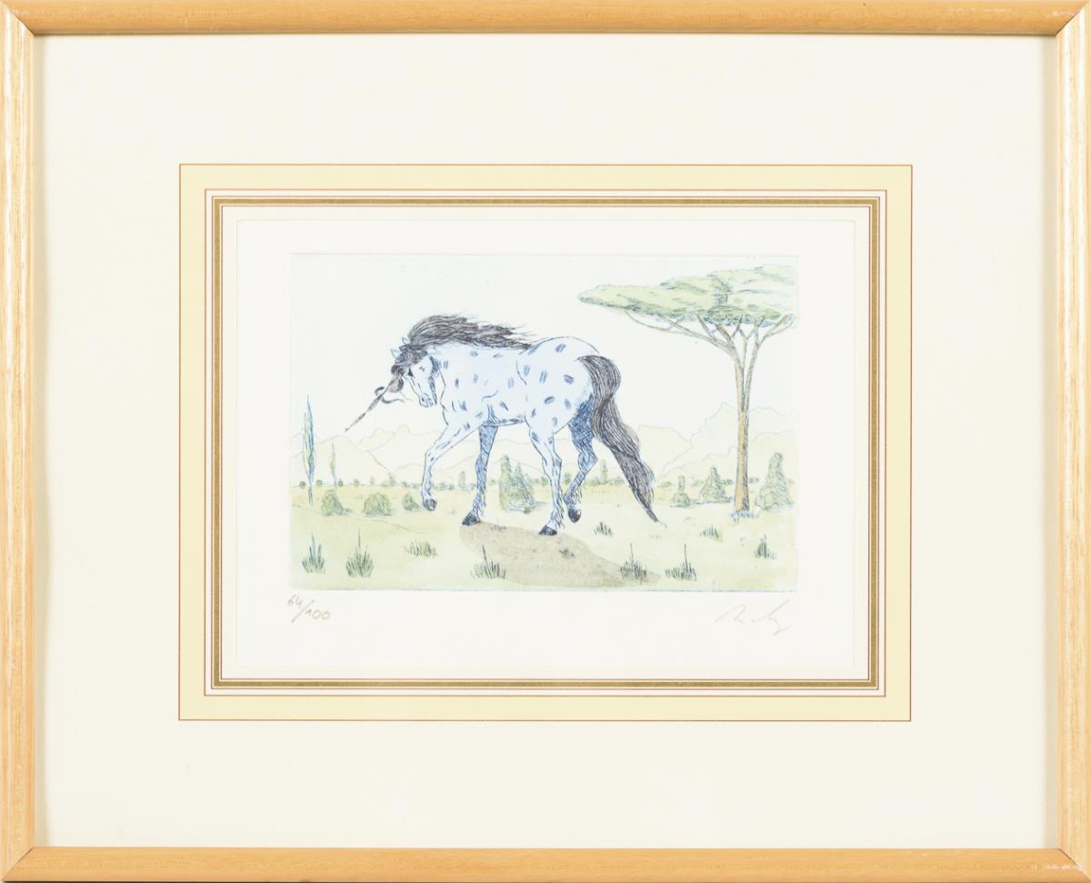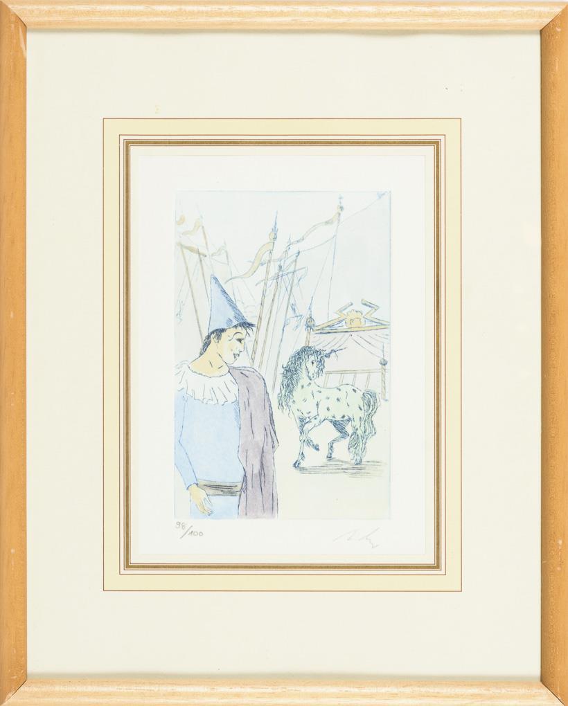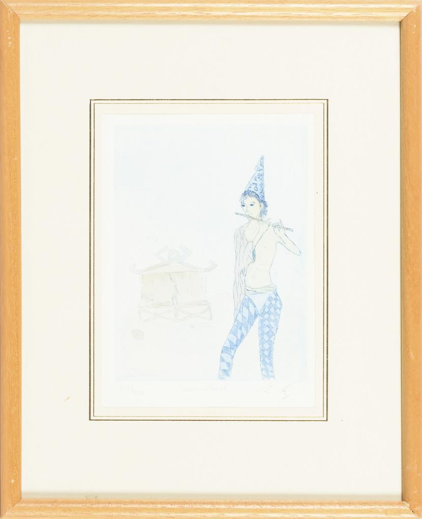 "Il Artista", Platte: 15,5 x 12 cm, Exemplar: 93/100, fleckig und stockfleckig | "Diva della Commedia", Platte: 15,5 x 12 cm, Exemplar: 71/100, etwas stockfleckig | Pierrot und Einhorn, Platte: 14,5 x 10 cm, Exemplar: 98/100 | Einhorn, Platte: 14,5 x 10 cm, Exemplar: 97/100, Rahmenglas fehlt | "Suonatore", Platte: 15,5 x 12 cm, Exemplar: 39/100 | Einhorn, Platte: 10 x 15 cm, Exemplar: 64/100.