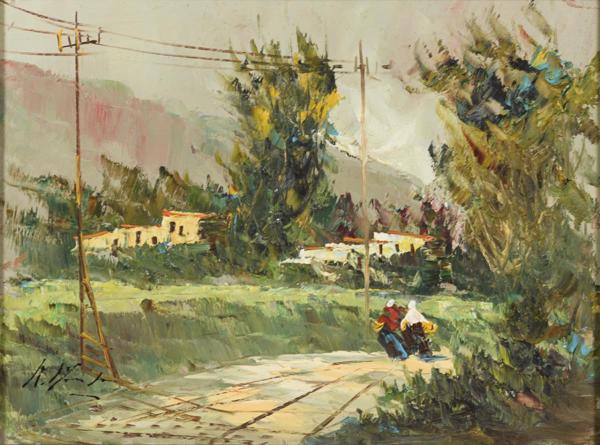 Staffagefiguren auf der Straße nahe einem Dorf.