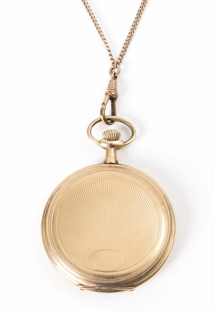Sprungdeckelgehäuse mit gestuftem Rand und Streifendekor, leere Ovalreserve. An vergoldeter Uhrenkette mit 2 Karabinern, L 55,5 cm. Minimale Alters- und Gebrauchsspuren.