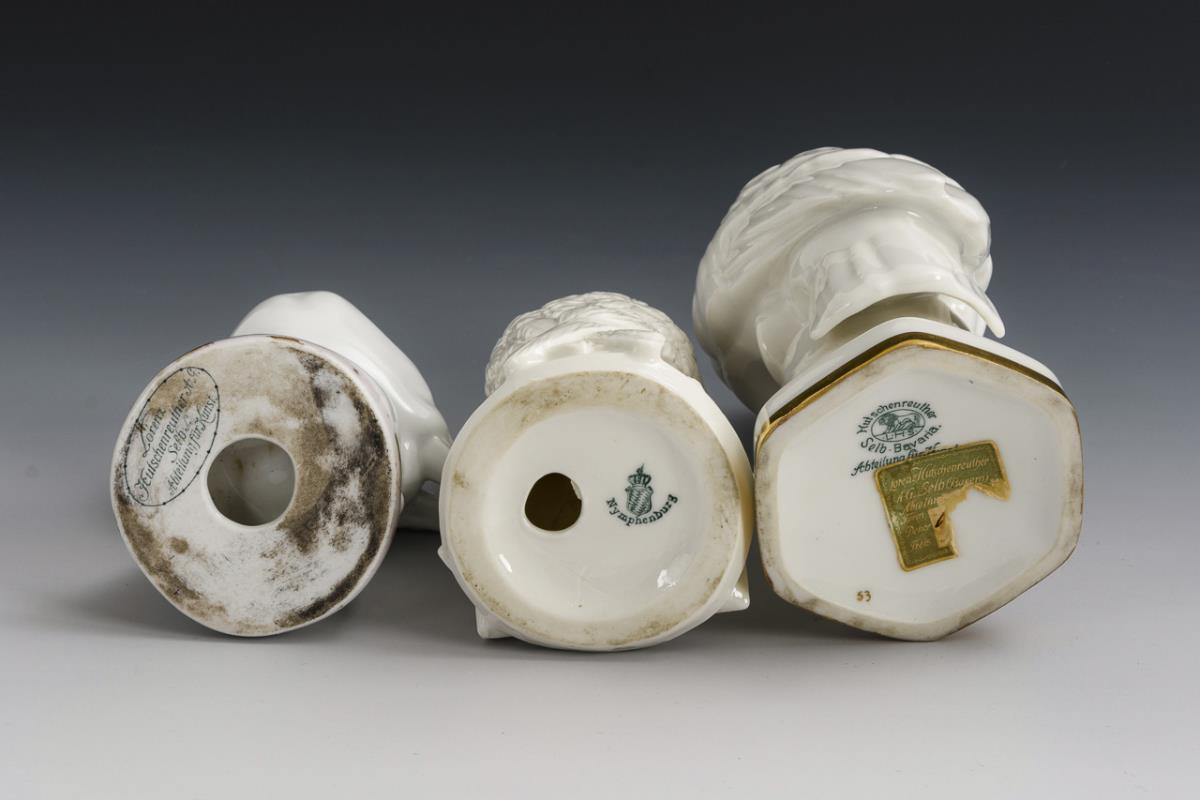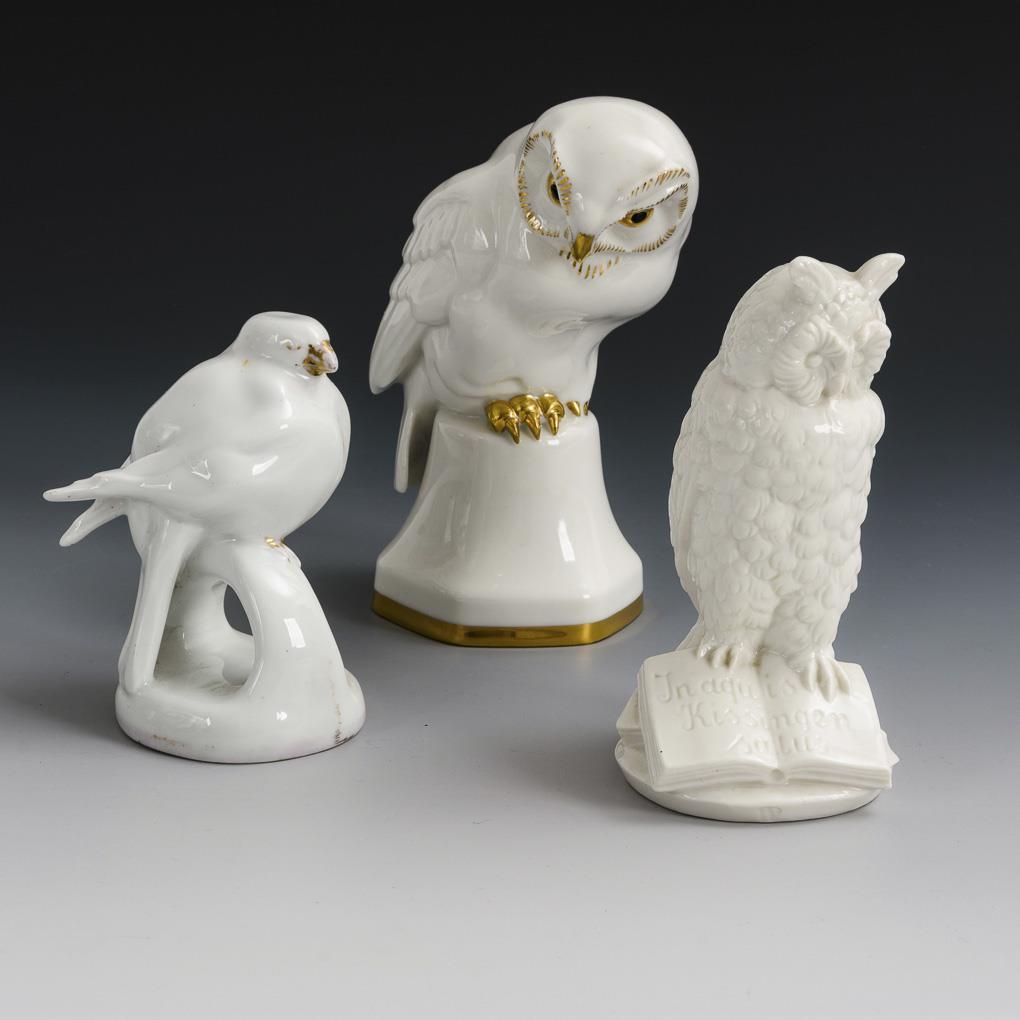 2x Hutschenreuther: Eule auf Sockel und Spatz auf einem Bogen sitzend. / 1x Nymphenburg: Auf einem aufgeschlagenem Buch sitzende Eule ("In aquis Kissingen salus"). 1x Gold berieben.