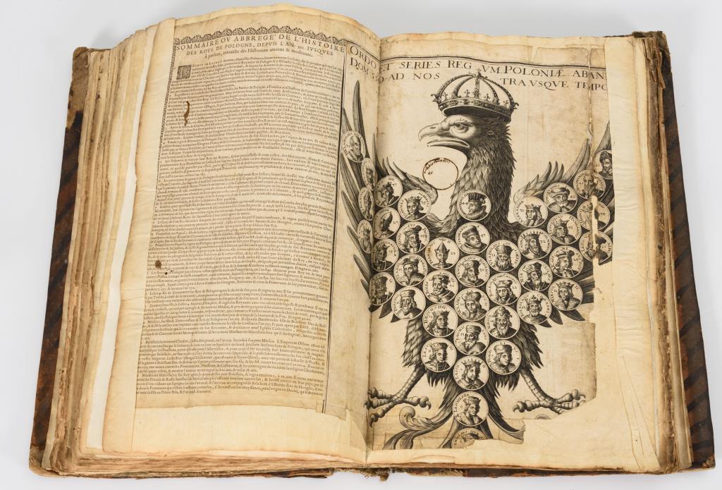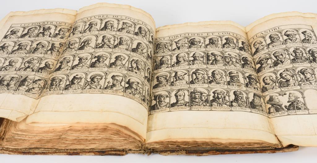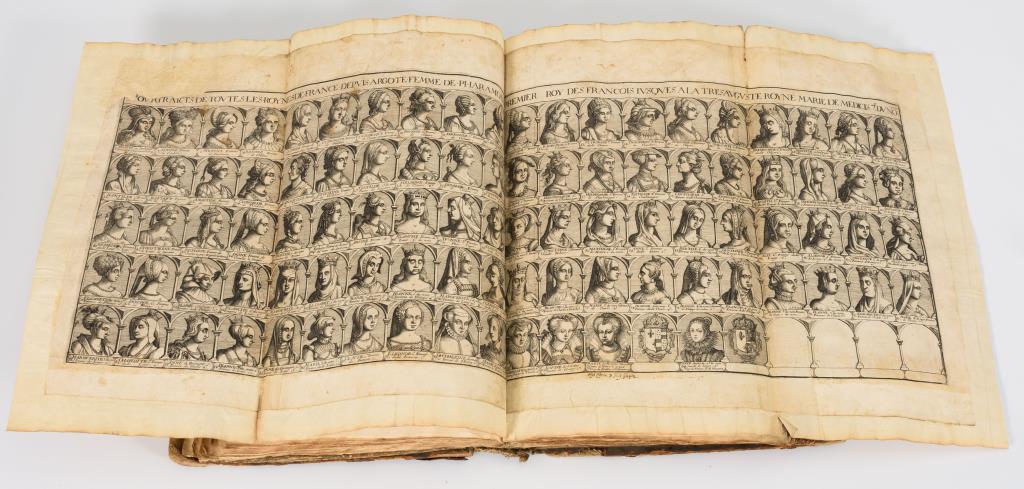 15 großformatige Doppelseiten (meist gefaltet) mit gestochenen Porträts verschiedener bedeutender Persönlichkeiten. Dazu je ein oder zwei Doppelseiten Text. Kein Titel. Die teils beschädigten/beschnittenen Blätter sind alt auf größeres Trägerpapier geklebt und so wieder zusammengefügt worden. (Nur geringe Bildverluste, fleckig). Der jetzige Ledereinband ist stark defekt. Auf den Kupferstich-Doppelblättern meist um die 100 Abbildungen in "Paßfotogröße". Hier vorhandene Darstellungen in Stichworten: Hebräische Herrscher, Päpste, Cäsaren, orientalische Herrscher, spanische Könige, französische Könige, Frauen französischer Herrscher, englische Könige, polnische Herrscher auf einem Adler angeordnet, Großmeister des Malteserordens, Stammbaum Savoyen, Herzöge von Brabant, Dogen von Venedig, bedeutende Personen, antike Schriftsteller. Ausgaben mit diesem Umfang extrem selten.
