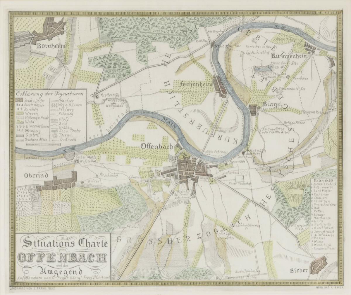 "Geometrischer Plan von Offenbach a/M nebst der 1830 von Goßherzogl. Hess. Staatsregierung genehmigten Stadterweiterung", Kupferstich, 47 x 57,5 cm, knittrig, griffspurig, etwas stockfleckig | Bayer, Franz: "Situations-Charte von Offenbach und der Umgegend", zeitgenössische kolorierte Radierung nach der Zeichnung von Carl Frank aus dem Jahr 1832, 41 x 46 cm.
