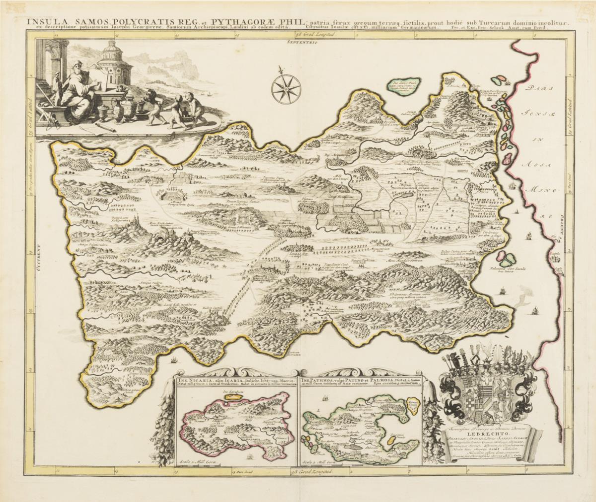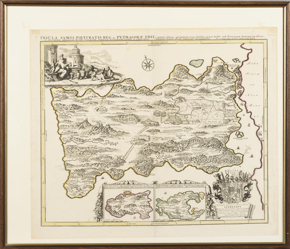 Detailreiche Karte der griechischen Insel Samos mit zwei kleinen Kartuschen der Inseln Ikaria und Patmos, bezeichnet "Insula Samos Polycratis Reg[is] et Pythagorae phil. patria", dekoriert mit Wappenkartusche mit Widmung an Prinz Emanuel Lebrecht von Anhalt-Köthen (1671 - 1704) "Serenissimo Principi ac Domino Domino Lebrechto, Principi Anhalt. Duci Saxon. [...]" und Vignette mit Darstellung des Erzbischofs von Samos, Joseph Georgiene; aus Reiner Ottens "Atlas maior cum generale [...]", 1641 - 1729. Bugfalte, etwas griffspurig, sichtbare Klebereste an den oberen Ecken.