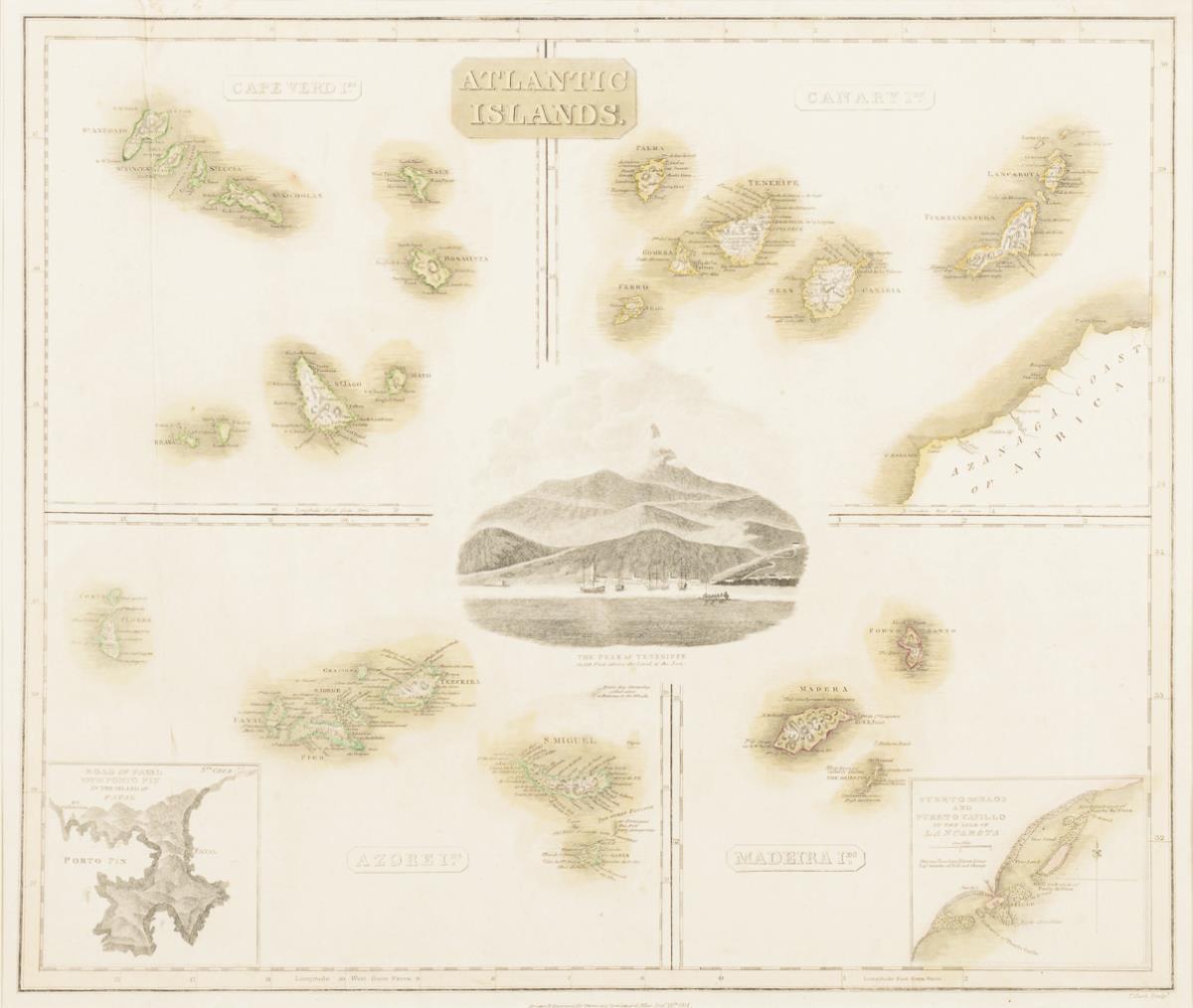 Detailreiche, 4-fach gegliederte Karte der Kanarischen Inseln "Cape Verd", "Canary", "Azore" und "Madeira", im Zentrum zentralperspektivischer Blick auf den Pico del Teide - Teneriffa, bezeichnet "Atlantic Islands", aus John Thomsons "New General Atlas", 1817. Etwas griffspurig.