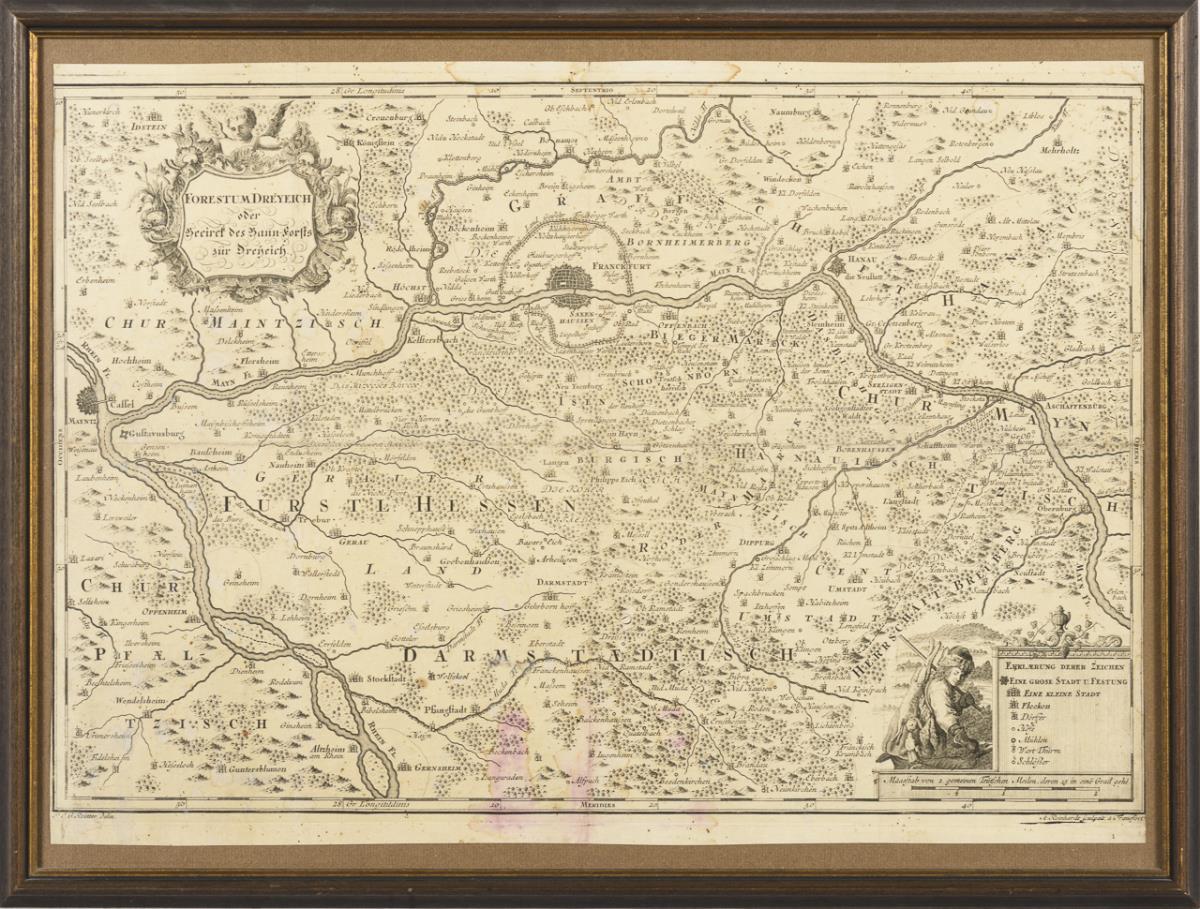 Detailreiche Karte des dichten Waldgebietes zwischen Rhein und Main, Titelkartusche "Forestum Dreyeich oder Becirck des Bann-Forsts zur Dreyeich", aus dem umfassenden Werk von Friederich Karl Buri zum Streit zwischen den Grafen Isenburg, den Grafen von Schönborn und der Reichsstadt Frankfurt um ihre Jagdrechte im Dreieicher Wildbann. Mehrfach gefaltet, fleckig, griffspurig, beschnitten.