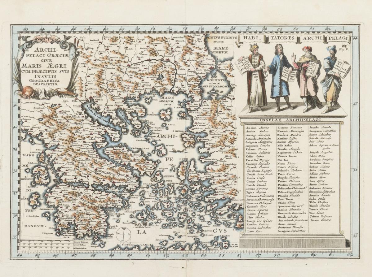 Dekorative Karte mit Titelkartusche "Archipelagi Graeciae sive Maris Aegei cum praecipus suis insulis geographica descriptio" und figurativer Legende der aufgeführten Inseln, aus "Atlas Novus", 1730 - 1737. Bugfalte, etwas griffspurig, Klebespuren.