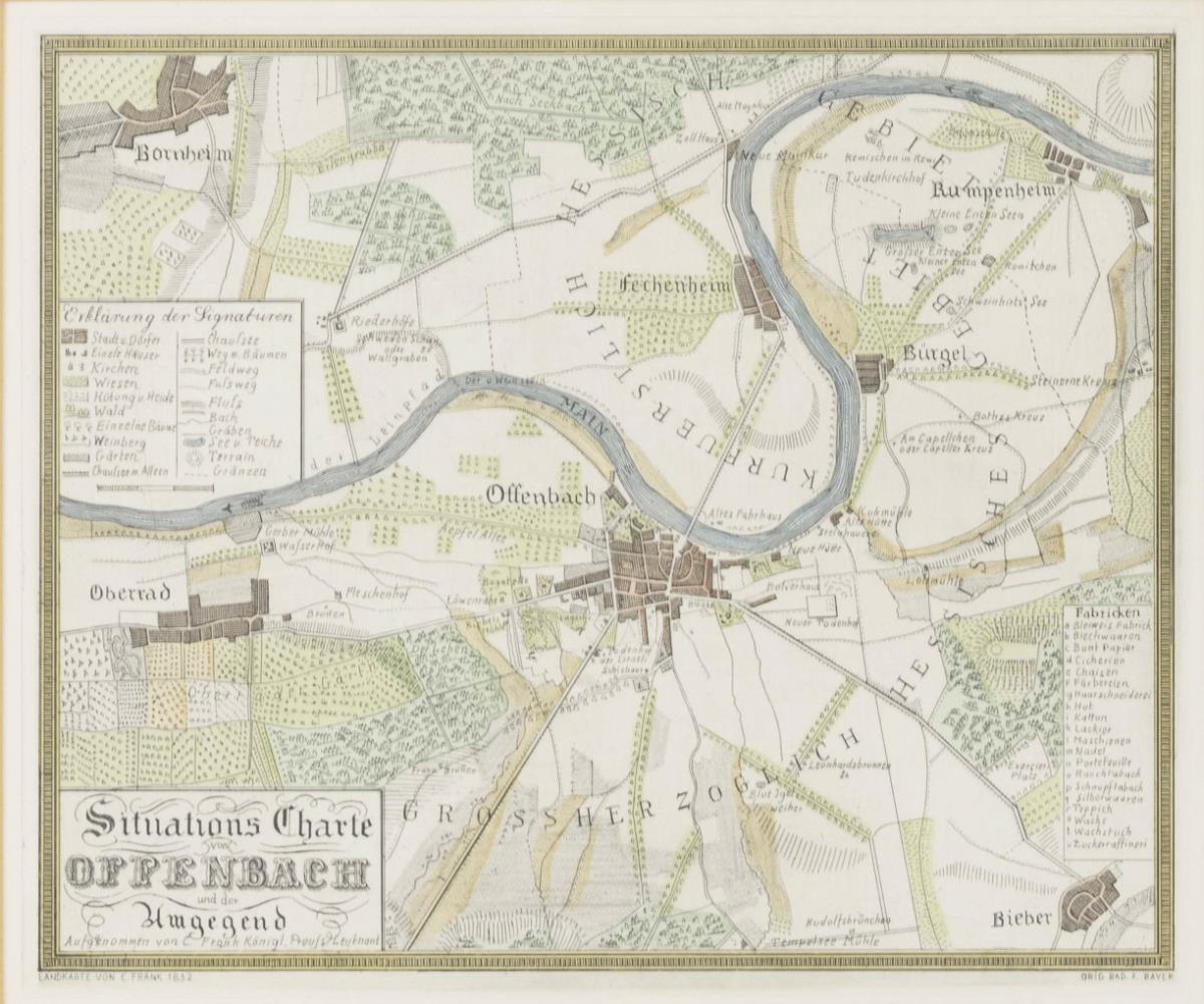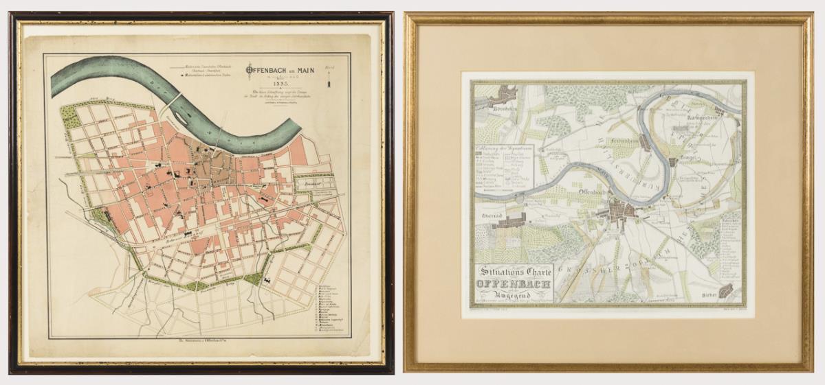 Eisenbahnkarte von Offenbach am Main, bezeichnet "Elektrische Trambahn Offenbach - Oberrad - Frankfurt", Farblithografie, 1885, Blatt: 44 x 46,5 cm, gerahmt und hinter Glas: 50 x 53 cm, stark griffspurig und geknickt | Bayer, Franz: "Situations-Charte von Offenbach und der Umgegend", zeitgenössische kolorierte Radierung nach der Zeichnung von Carl Frank aus dem Jahr 1832, 41 x 46 cm.