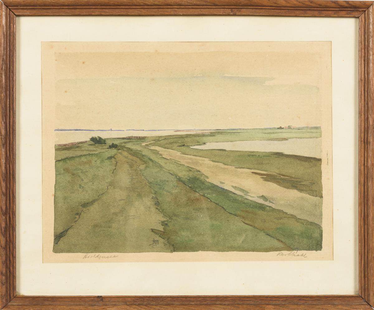 Weite flache Küstenansicht unter grauem Himmel. Minimale Altersspuren.