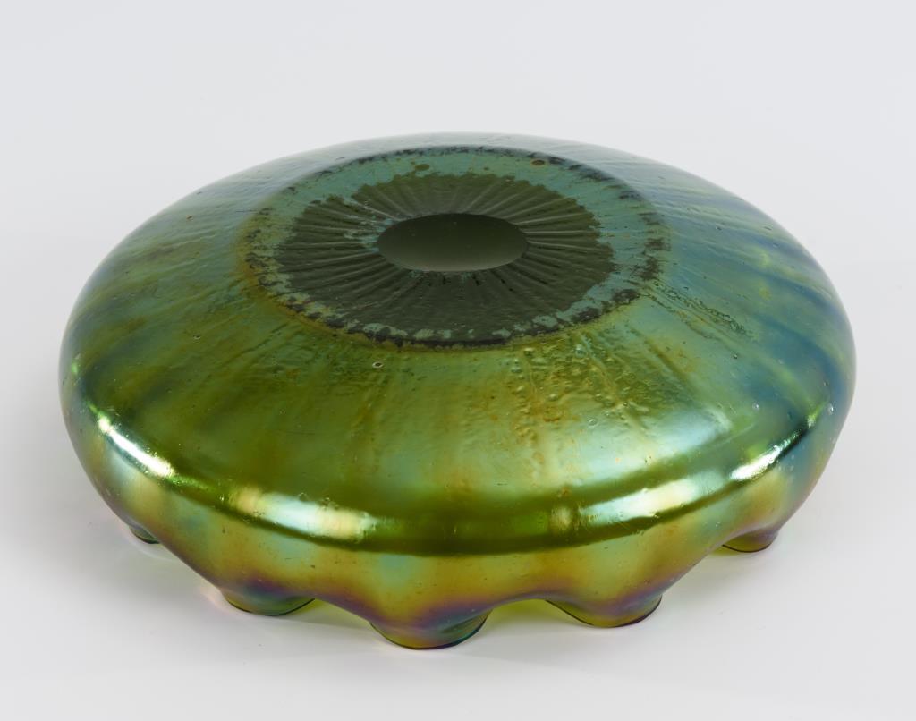 Grünes, längsoptisch formgeblasenes, irisiertes Glas.Ø 22 cm.