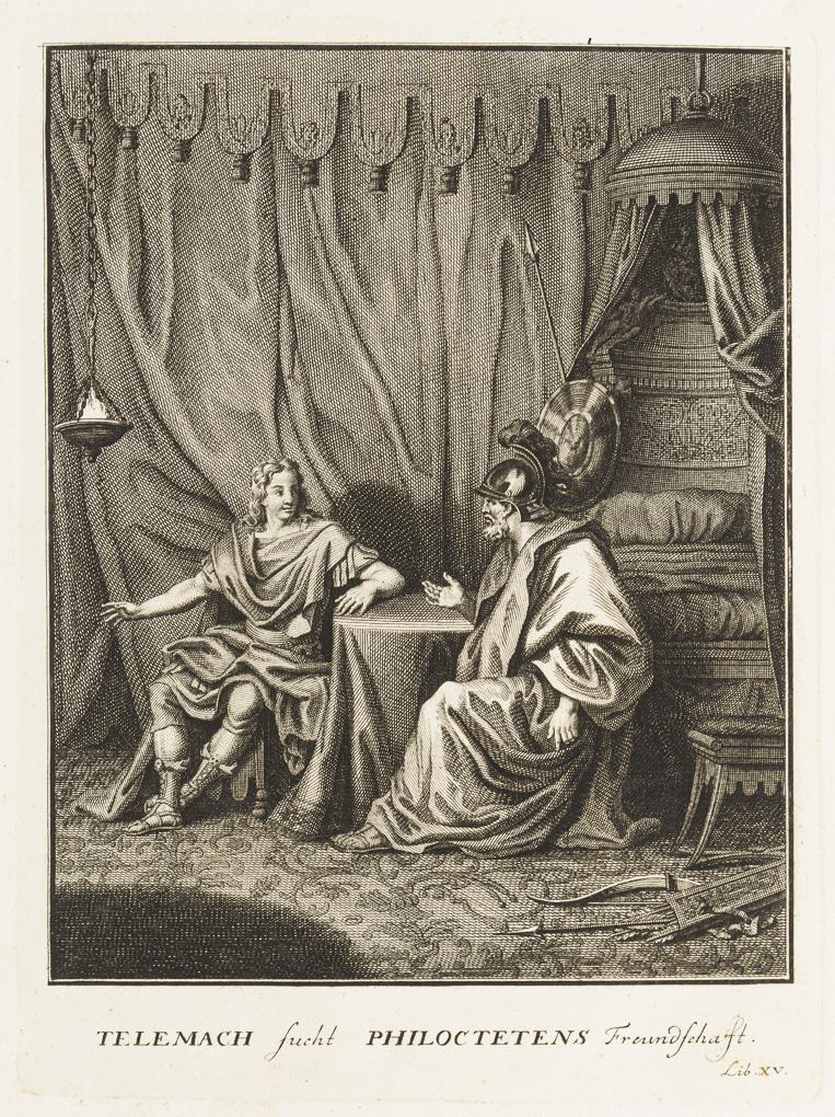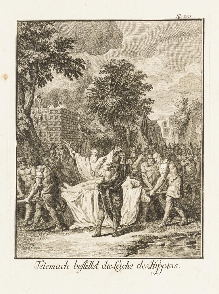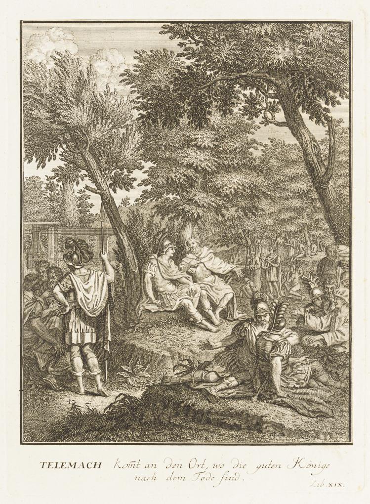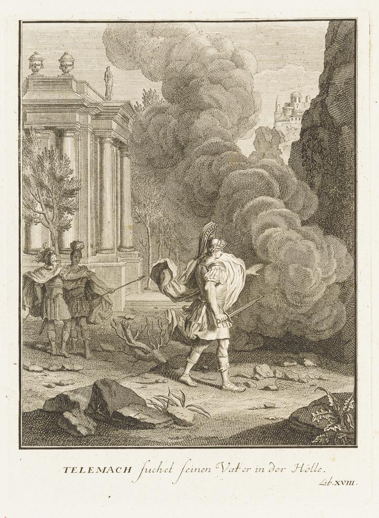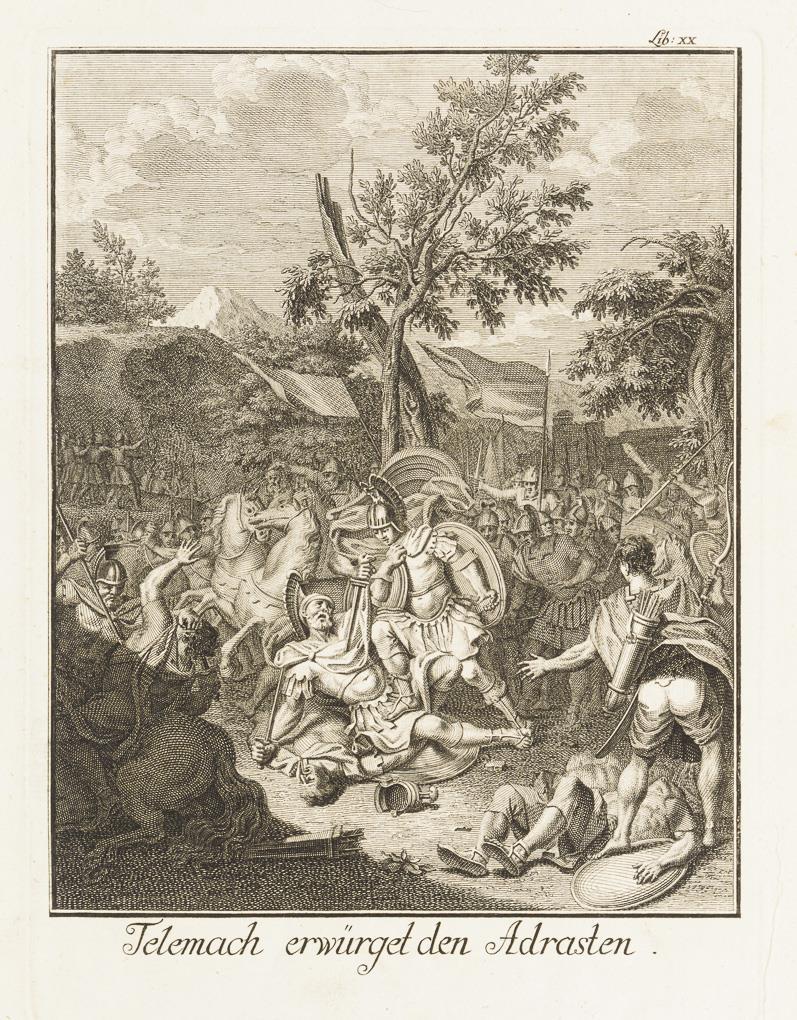 Mappe mit 12 Illustrationen und 1 handschriftlichen Namensregister, aus François Fenelons Erzählungen "Les Aventures de Télémaque", hier aus der ersten deutschen Übersetzung von 1727 "Die Begebenheiten Des Prinzen von Ithaca", Mappe bezeichnet "Kupferstiche zur Geschichte der Alten Welt". Fadenheftung lose, Blätter griffspurig und mit kleinen Flecken, Ränder bestoßen.
