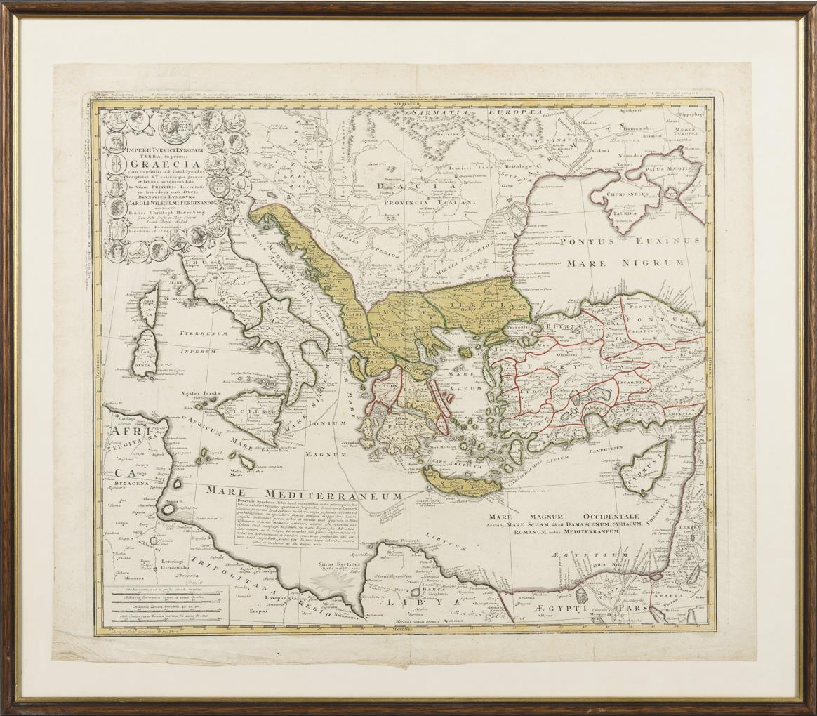 Detailreiche Karte des Türkischen Reiches mit seinen europäischen Gebieten Unteritalien, Dalmatien und Griechenland, umgeben von Kleinasien und Ländern des östlichen Mittelmeeres, Titelkartusche mit zahlreichen Medaillen "Imperii Turcici Europaei terra, in primis Graecia [...]". Bugfalte, griffspurig, knittrig.