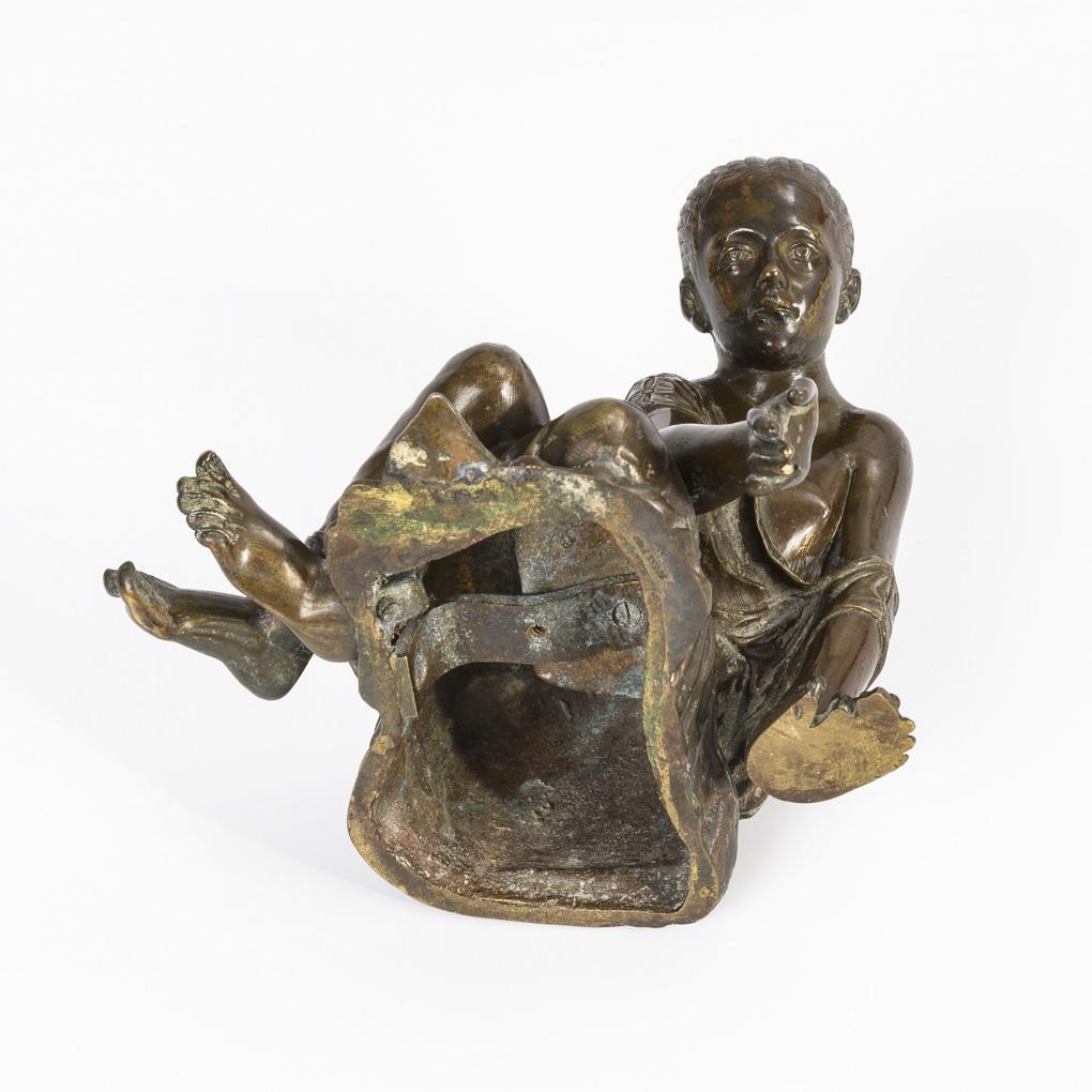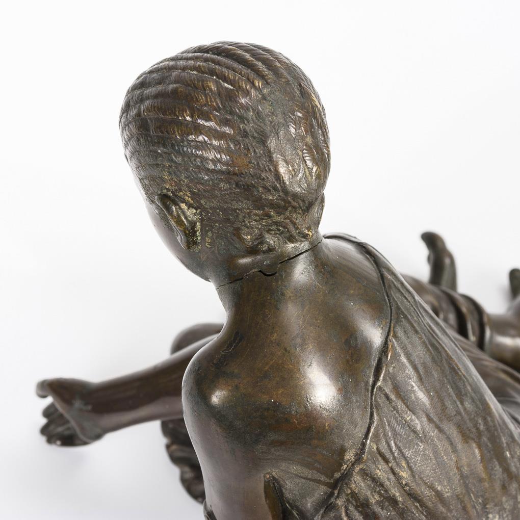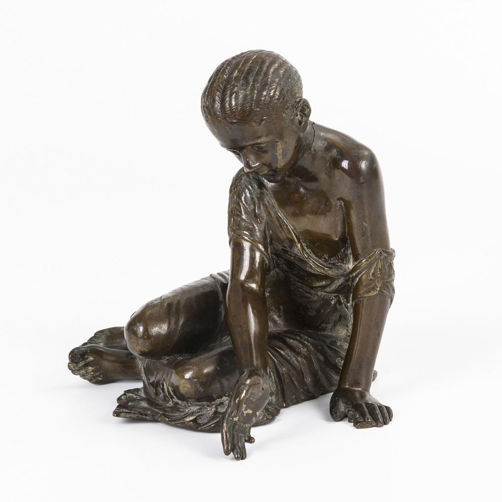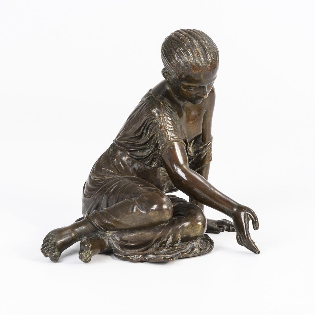 Nach antikem Original gestaltetes Mädchen beim Spiel auf dem Boden. Halsfuge teils offen, 1 Arm gelockert, starke Alters-/Gebrauchsspuren.