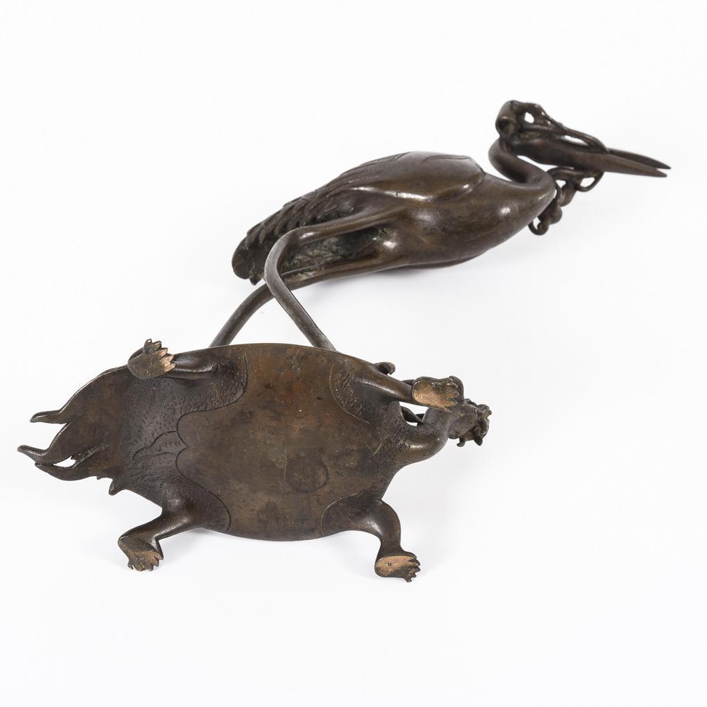 Vogel mit Lotosstengel im Schnabel auf Minogame. Feine Ausführung des Glückssymbols. Einsatz für Kerzenhalter o.ä. fehlt, Beine wohl angelötet.