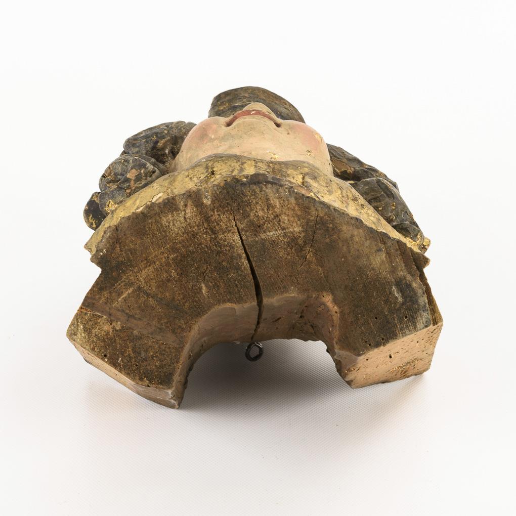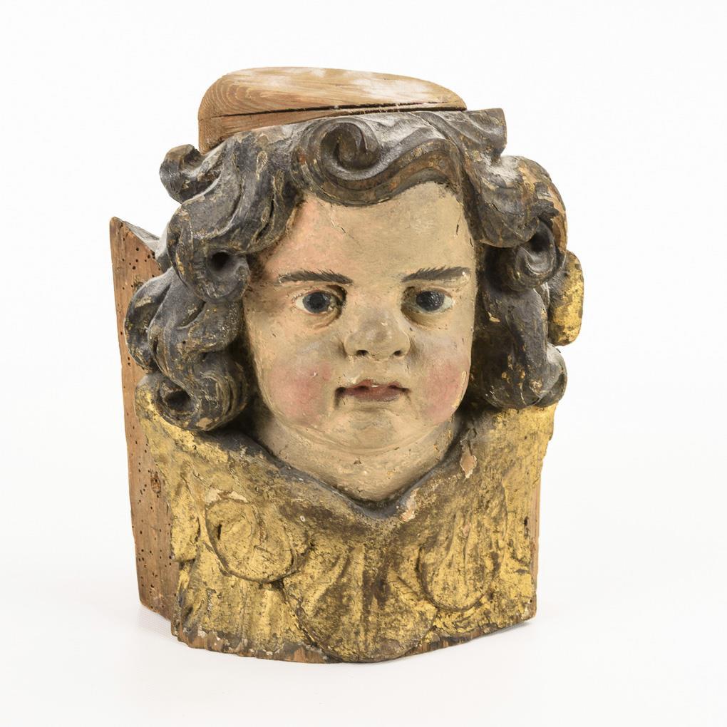 Noch im Stil des Barock gestalteter Kopf; ursprünglich Engelsflüchte. Flügel fehlen, Fassung übergangen, Sägespuren zumindest unten, Anobienspuren, Ergänzung auf dem Kopf, Alters-/Gebrauchsspuren.