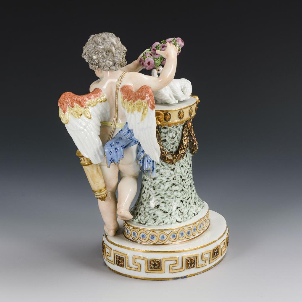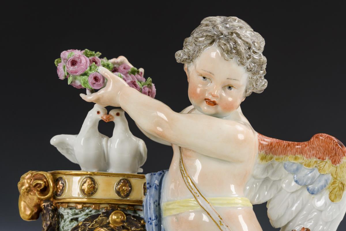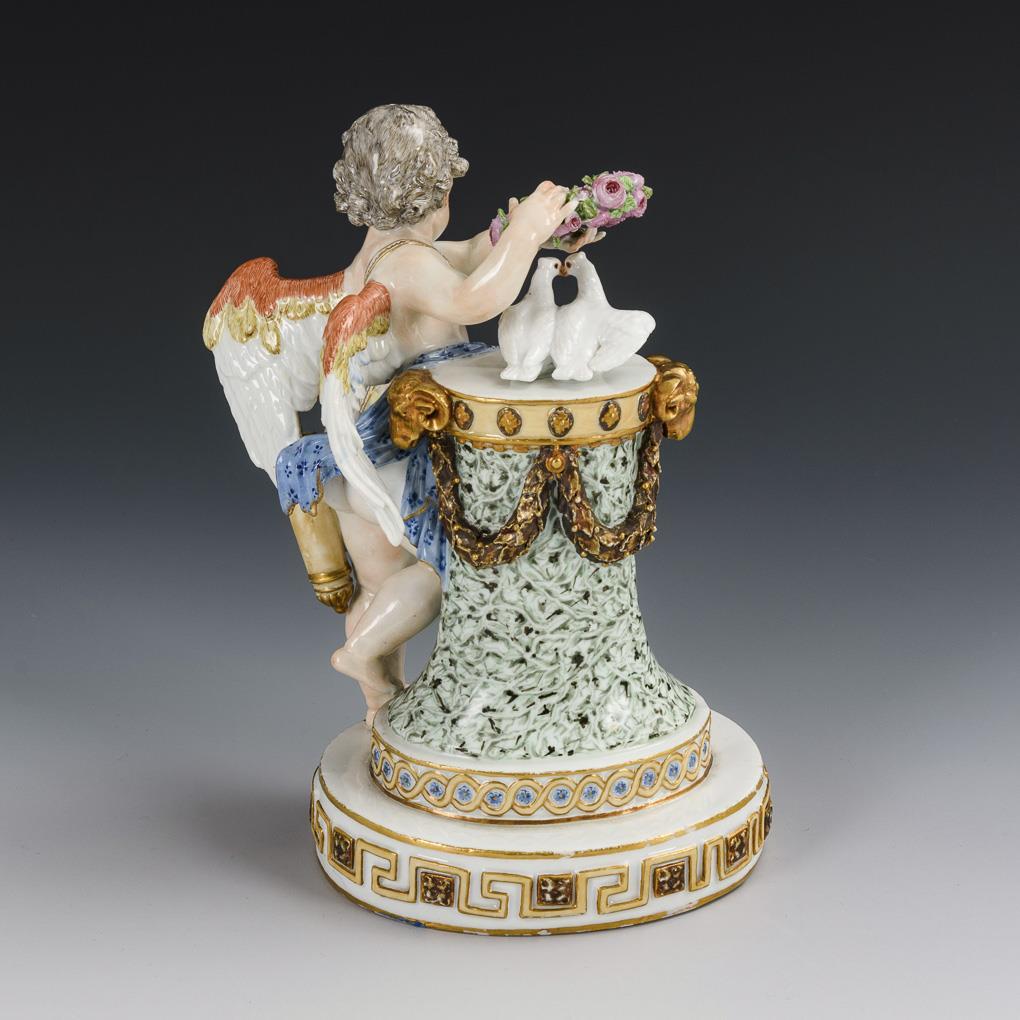 An einem Widderkopfpostament stehender Amorknaber, einen Rosenkranz über ein Taubenpärchen haltend, auf dem Postament die Aufschrift "L'amité couronnée". Pfeilenden im Köcher restauriert, partiell Blätter am Rosenkranz restauriert.