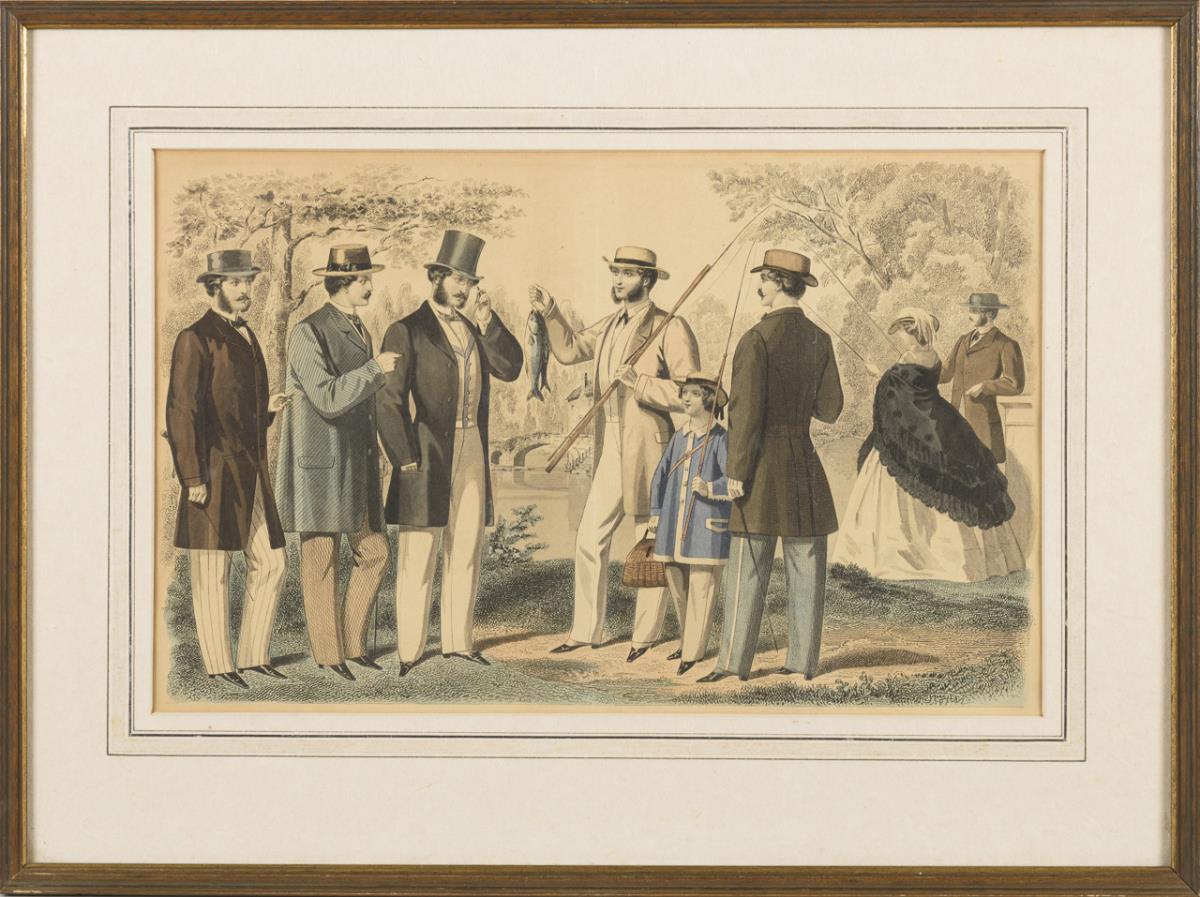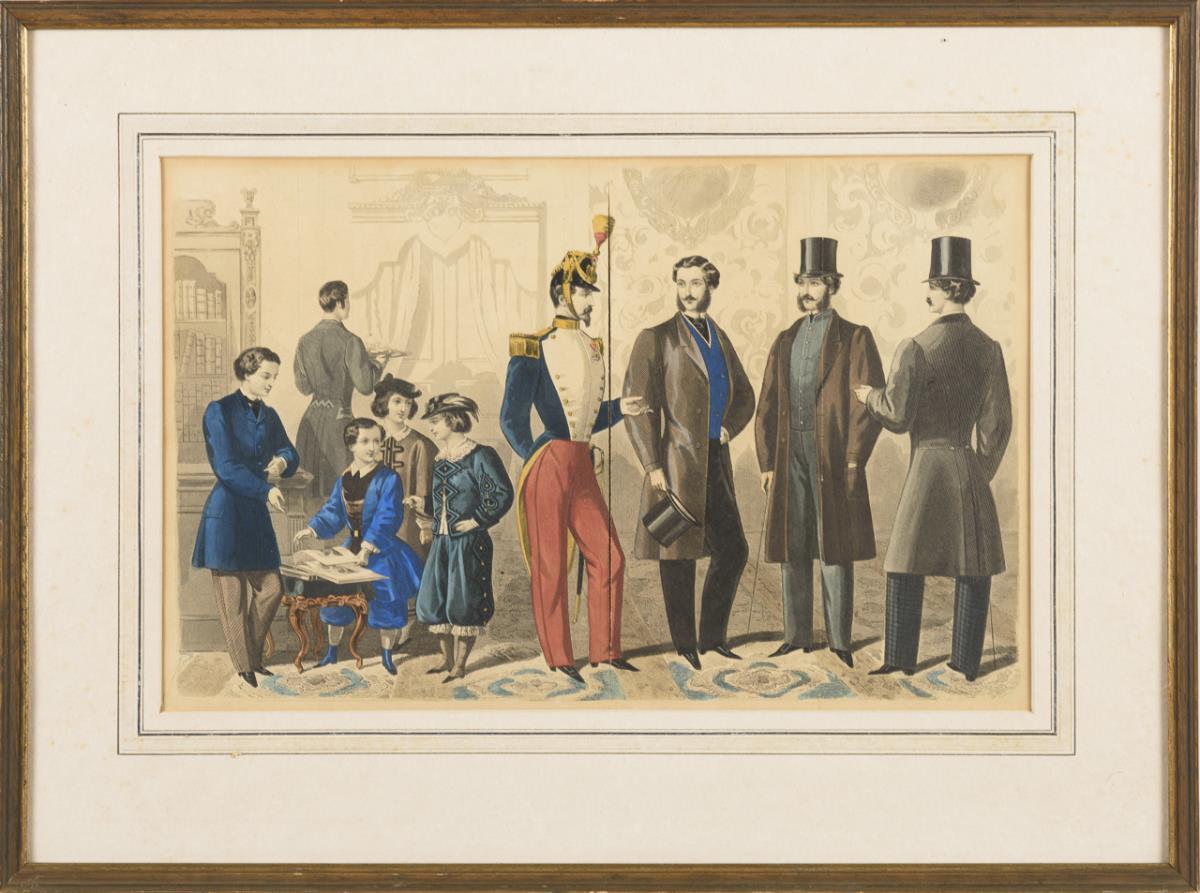 5 Katalogblätter mit europäischer Herrenmode des späten 19. Jahrhunderts, aus dem Modejournal "Le Progrès - Modes de Paris pour la Gazette Européenne des Modes". Je mehrfach gefaltet, teils gerissen.