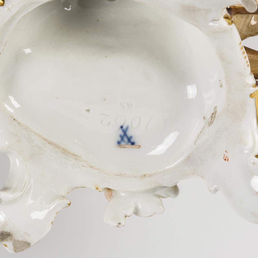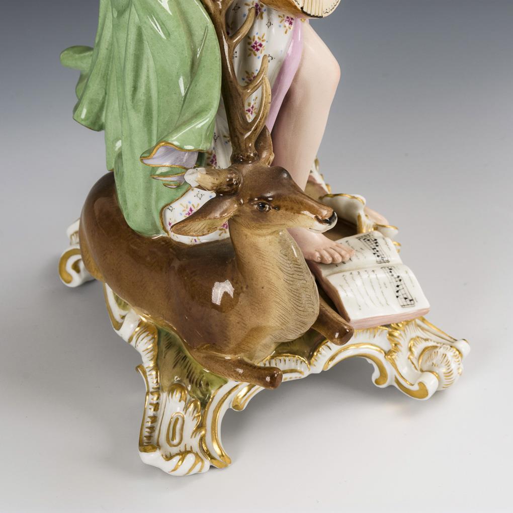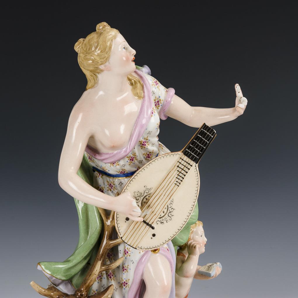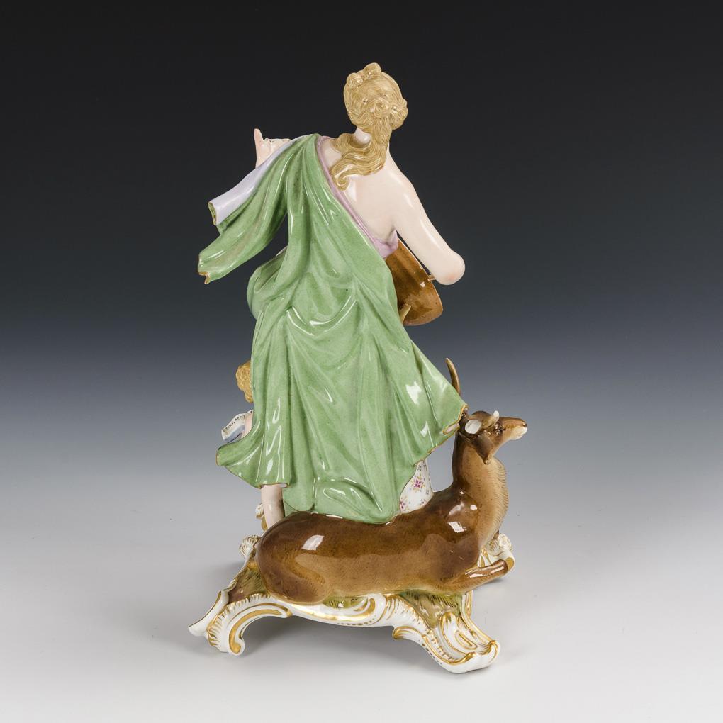 An einem liegenden Hirsch stehende, eine Laute spielende junge Dame als Allegorie des Gehörsinns. Lautenkopf fehlt, Hände defekt, 1 Geweihstange bestoßen, Brandriss im rechten Fuß der Dame.