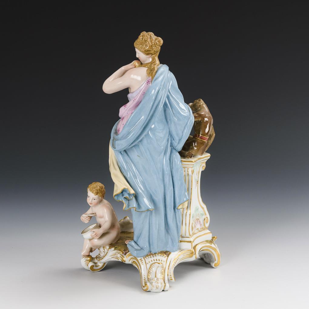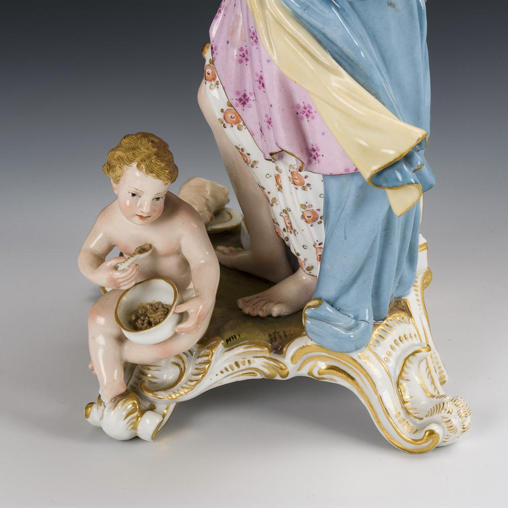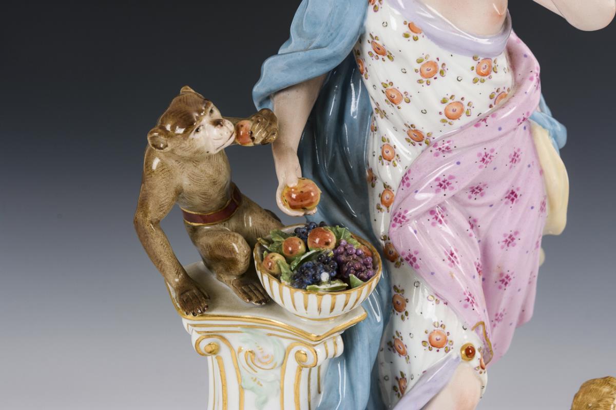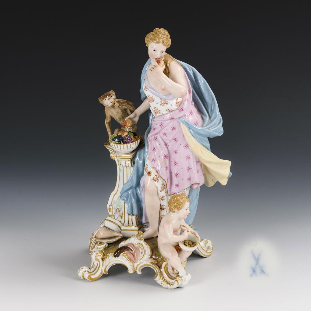 An einem Postament mit Fruchtschale und Affe stehende, einen Apfel essende Frau als Allegorie des Geschmacksinns. 1 Fuß des Putto fehlt, Bestoßungen an der Fruchtschale, geklebter Chip am Gewandsaum.