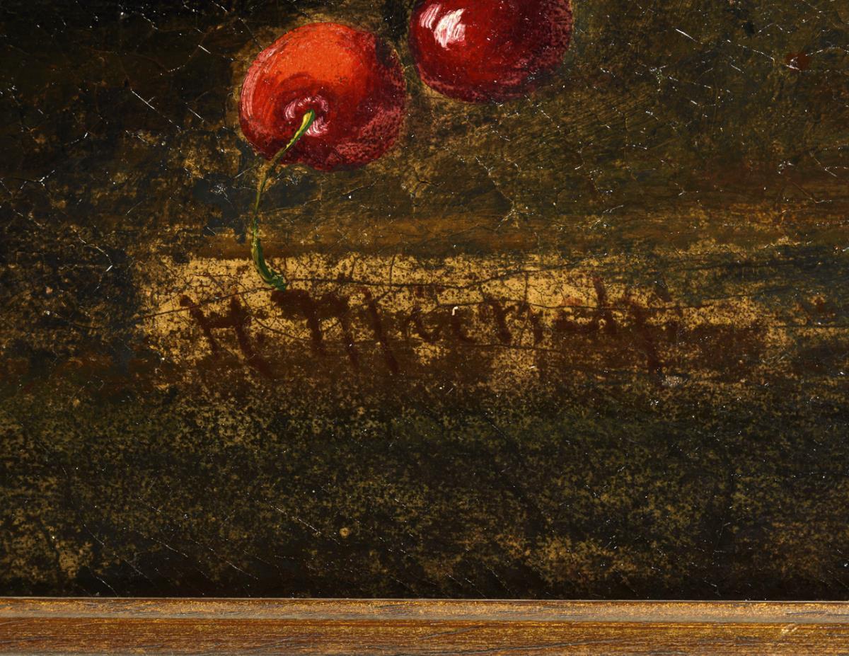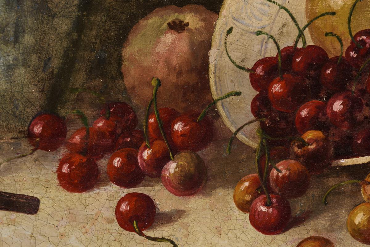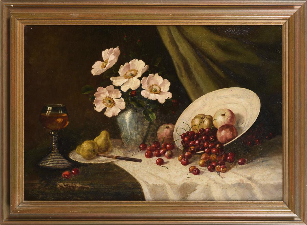 Weinglas neben Teller mit Birnen, einem Blumenstrauß sowie einer gekippten Schale mit Kirschen und Äpfeln. Restauriert.