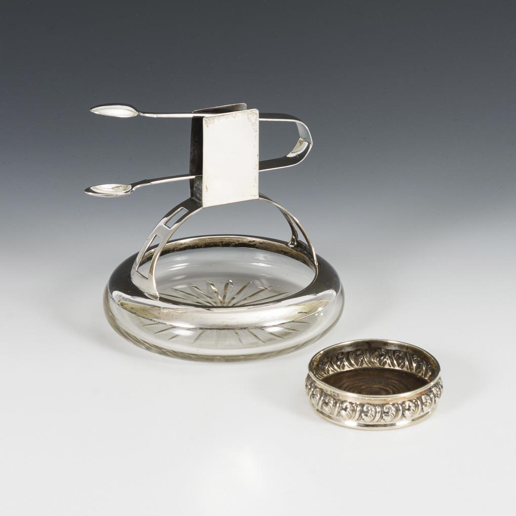 Runder Glasaschenbecher mit Silberrand und Halterung für Streichholzschachteln. Kleiner Untersetzer mit Holzboden und Silberrand. Zuckerzange mit Monogrammgravur "H". Teils etwas gedellt.