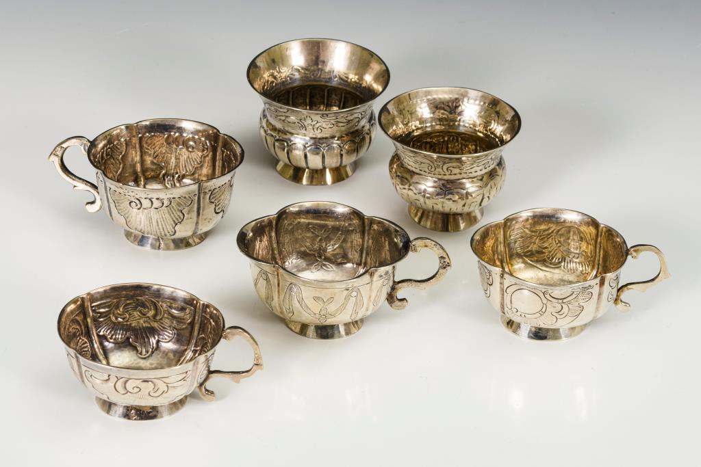 Je gravierte und punzierte Becher; 4x mit Henkeln und passiger Wandung. Teils Gebrauchsspuren.