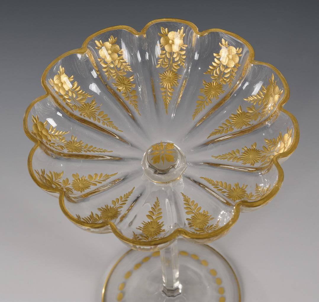 12-fach segmentierte Schale mit vergoldetem Floralschliff, auf facettiertem, konischem Stängel, Rundfuß mit vergoldetem Linsenschliff.