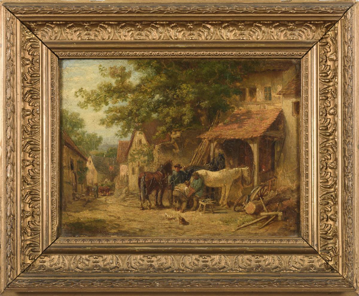 Die Tiere beim Hufschmied in der Gasse im Sonnenschein. Leichte Altersspuren.