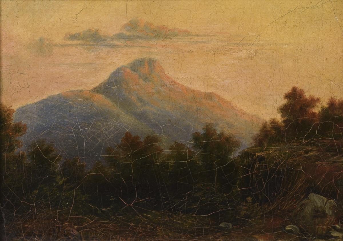 Abendlicht über den Berggipfeln und Baumkronen. Altersspuren.