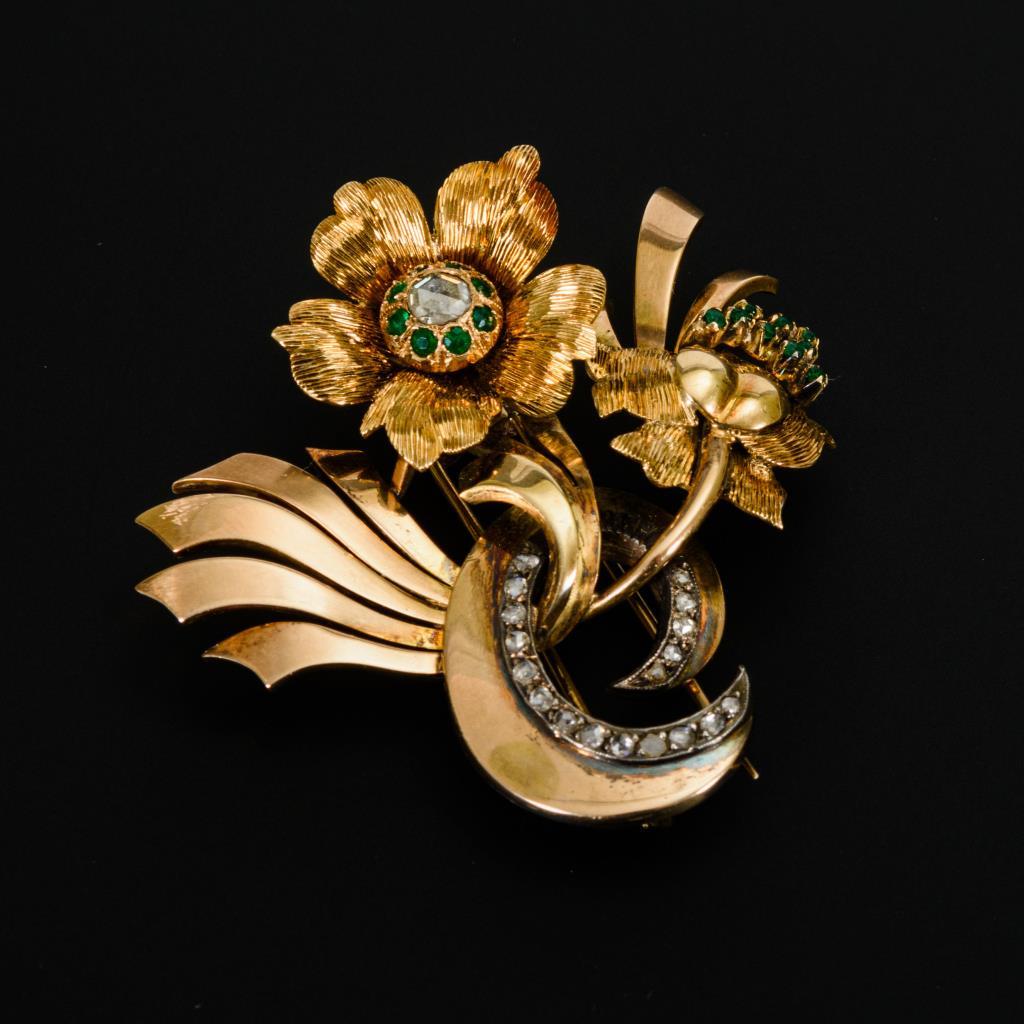 Große Phantasie-Blüte, besetzt mit Altschliff-Diamant, 18 kleinen Diamantrosen und 17 Smaragden. 2-stegige Broschierung wohl ergänzt.
