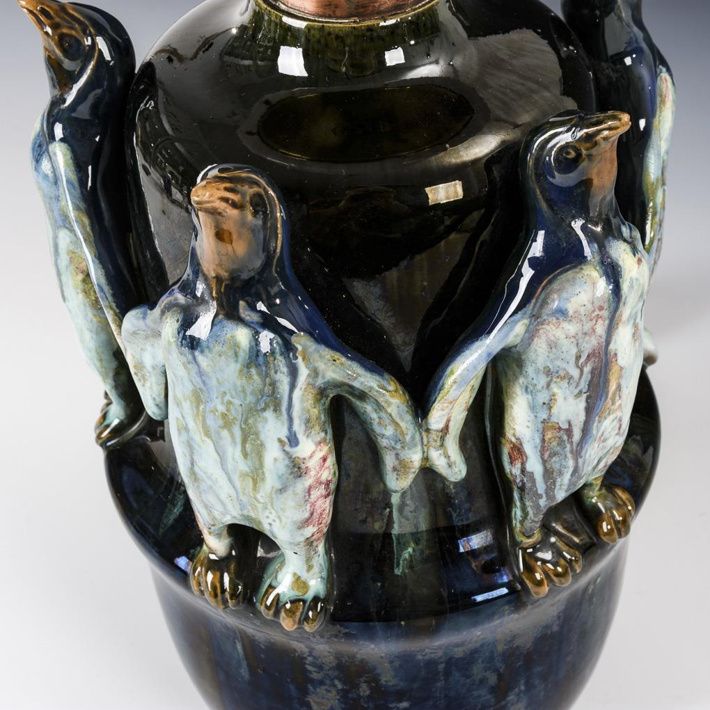 Zylinderform mit umlaufend 5 plastischen Pinguinen. Konischer Lampenschirm aus Milchglas mit Klarglas überfangen, Porzellanfassung mit Drehverschluss. Jünger elektrifiziert, funktioniert. 2 Pinguine an Kopf und Schnabel restauriert, Knöchelbereiche partiell glasurrissig, Lötspuren.