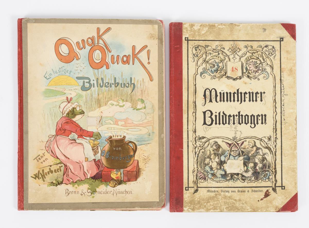 Bromberger/Herber: "Quak Quak!", Braun & Schneider, München o.J., 35 Seiten teils mit Farblithographien, Halbleineneinband, 34 x 25,5 cm. / "Münchner Bilderbogen" Nr. 48, Verlag von Braun & Schneider. Blätter 1129-1147, starke Gebrauchsspuren, Kinderzeichnungen, Halbleineneinband, 34 x 23 cm. / "Die Kriegsnummer des Kladderadatsch 1870/71", Hofman & Comp., Berlin 1895. Halbleineneinband, Block etwas lose, 32,5 x 23,5 cm. Alle mit Alters- und Gebrauchsspuren.