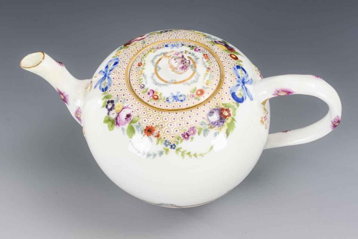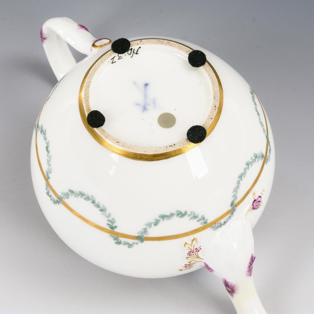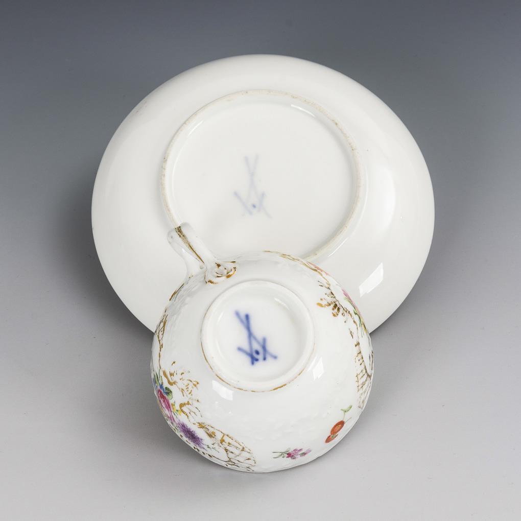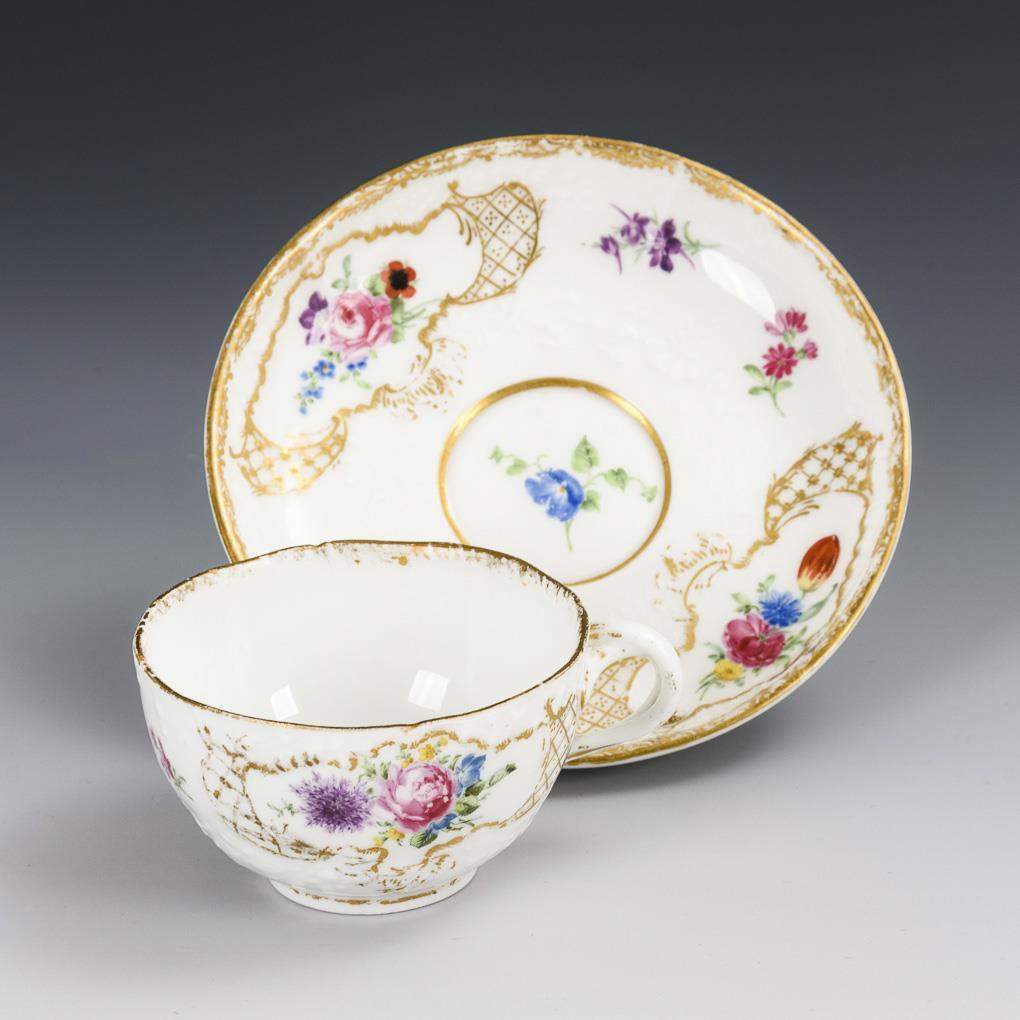 Teekanne mit Blatt- und Blütengirlanden (H 11,5 cm). / Tasse (H 4,5 cm) und originale Untertasse (Ø 13,5 cm) mit dem Reliefdekor "Marseille" sowie kleinen Blumenbuketts. Schneppe der Teekanne restauriert, partieller Goldabrieb.
