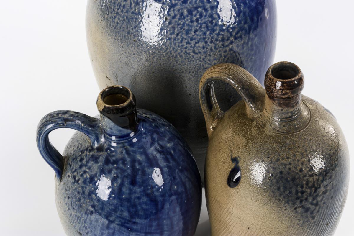 Graues, salzglasiertes Steinzeug mit kobaltblauem Smaltebewurf, braun glasierter Hals. H 23,5 bis 34 cm.