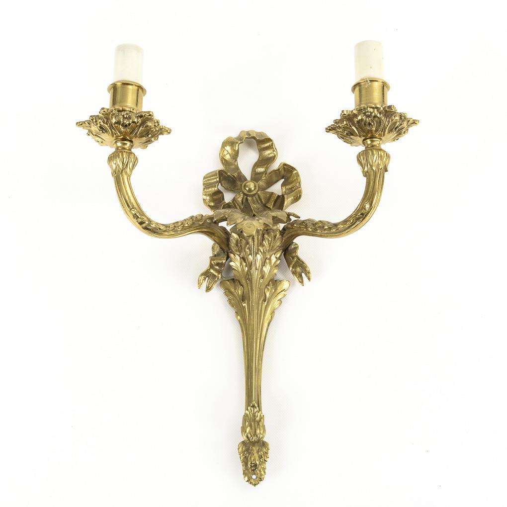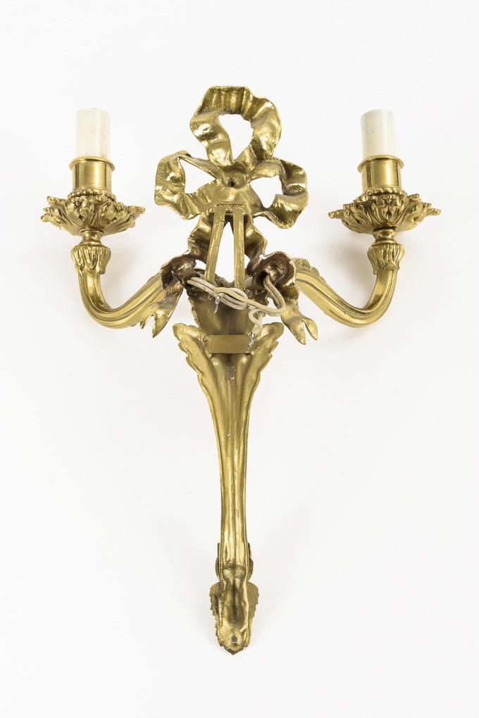 Vegetabil gearbeitete Wandapplik mit Schleifenbekrönung sowie Schraubfassungen in den Papp-Kerzenhülsen. Minimale Risse an der Schleife.