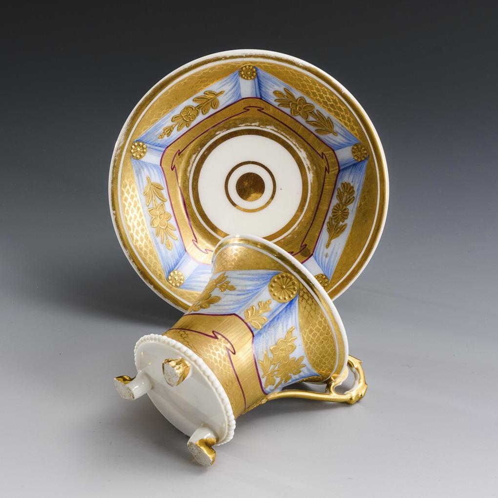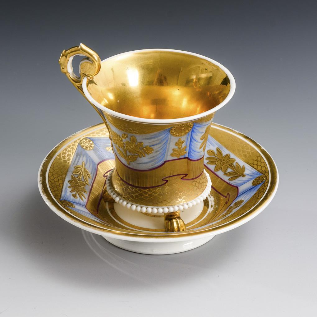 Kratertasse mit Perlband, Rosettenhenkel und drei Tatzenfüßen. Radierter Goldfond, reliefgoldgemalte Blütenzweige auf blauer Tuchdraperie. Minimaler Goldabrieb am Untertassenrand.