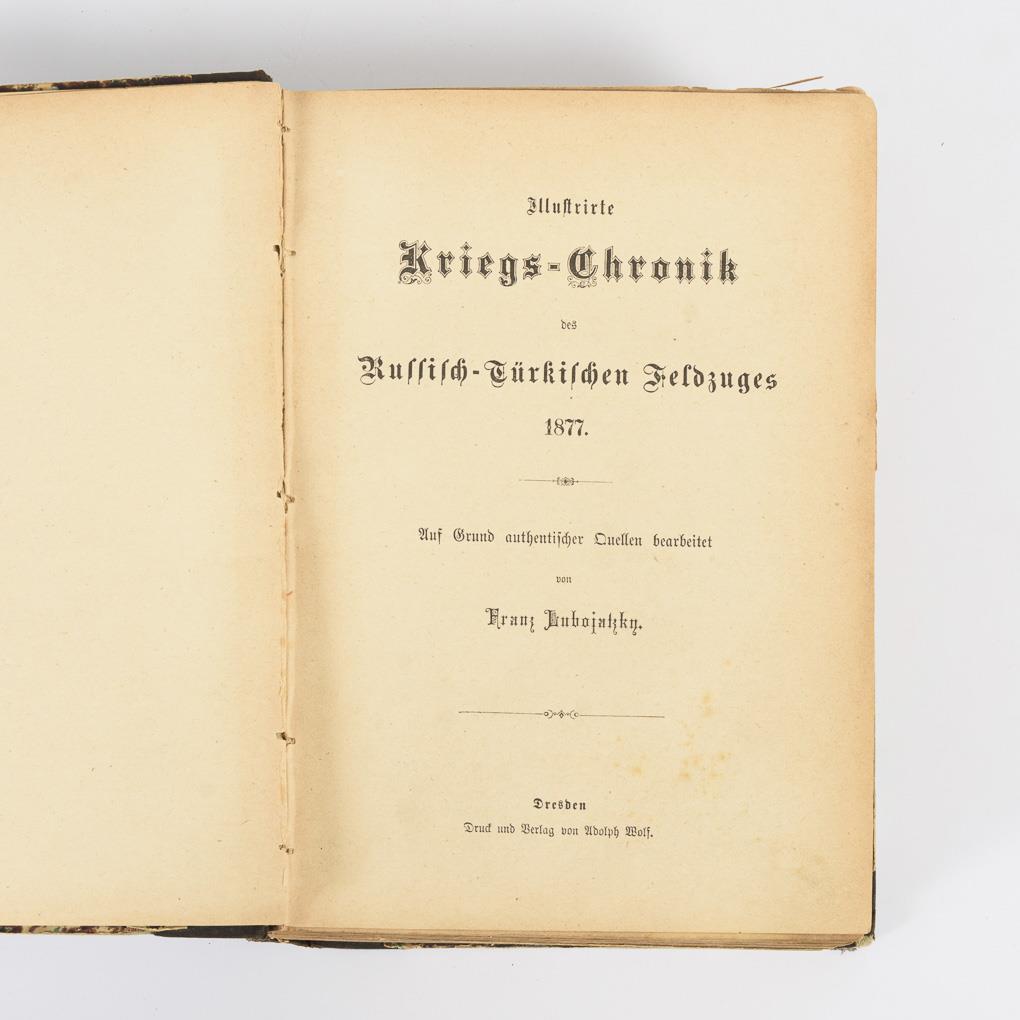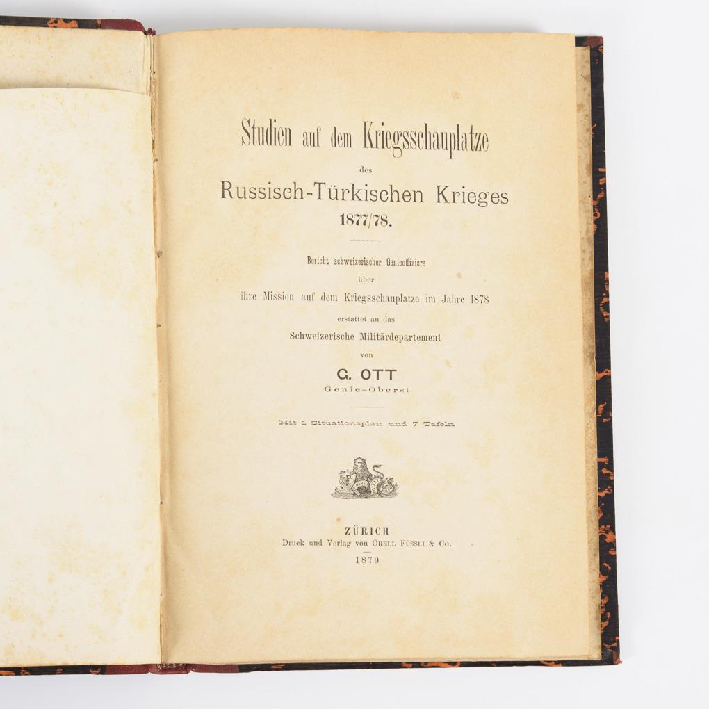 Richard Graf von Pfeil: "Erlebnisse eines Preußischen Offiziers in Russischen Diensten während des Türkischen Krieges 1877/78", Verlag Ernst Siegfried Mittler und Sohn, Berlin 1892, 4. Auflage . 324 Seiten, Roter Leineneinband, 22,5 x 15 cm. / G. Ott: "Studien auf dem Kriegsschauplatz des Russisch-Türkischen Krieges 1877/78. Bericht schweizerischer Genieoffiziere ...", Zürich 1879, 139 Seiten und 8 Tafeln. Halbleineneinband, 23,5 x 16 cm. / Lubojatzky: "Illustrierte Kriegs-Chronik des Russisch-Türkischen Feldzuges 1877", Dresden o.J., 756, (5) Seiten mit s/w Illustrationen und Farblithographien. Halbleineneinband 22,5 x 17 cm, Altersspuren.