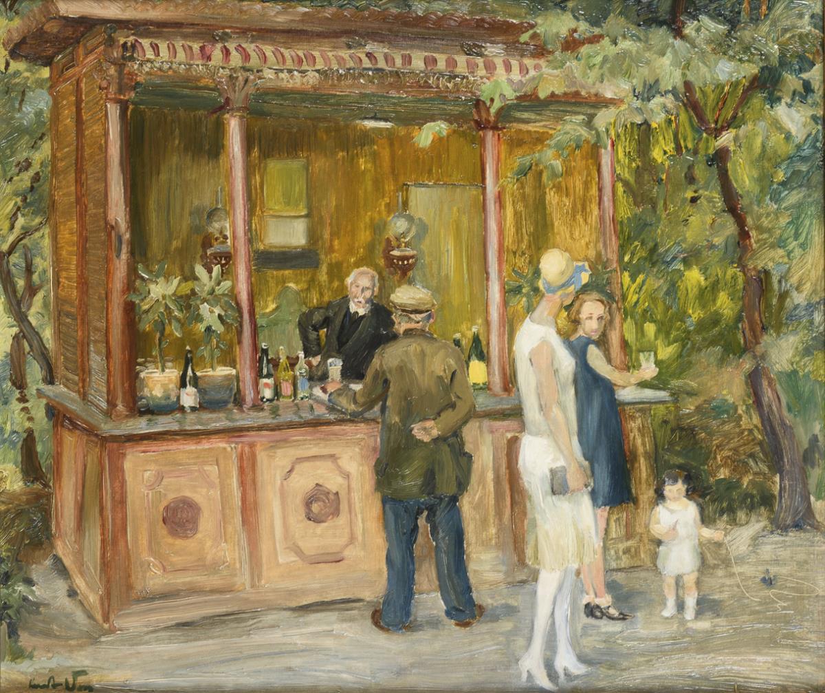 Zwei Frauen und ein Kind sowie ein älterer Mann vor der Trinkstube im Park bei schönem Wetter.