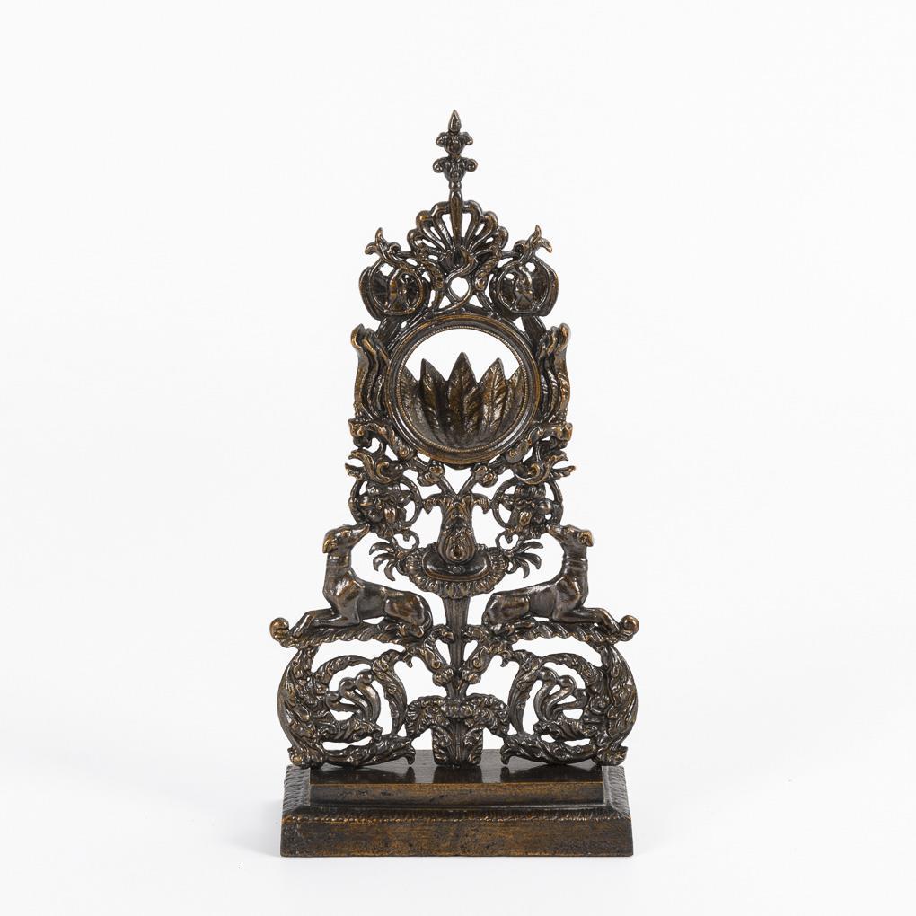 Fein durchbrochener und beidseitig vollplastisch gefertigter Ständer mit 2 Windhunden und Vögeln, Blatt- und Muschelwerk, auf flachem Rechtecksockel mit Zungenfries.