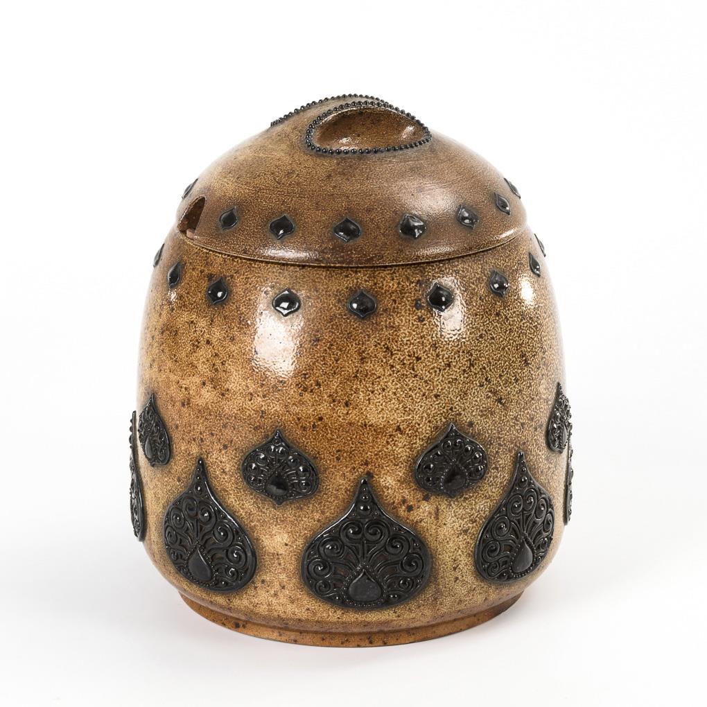 Konische Form mit tropfenartigen Reliefornamenten, gewölbter Deckel mit Griffmulden und Kellenöffnung.