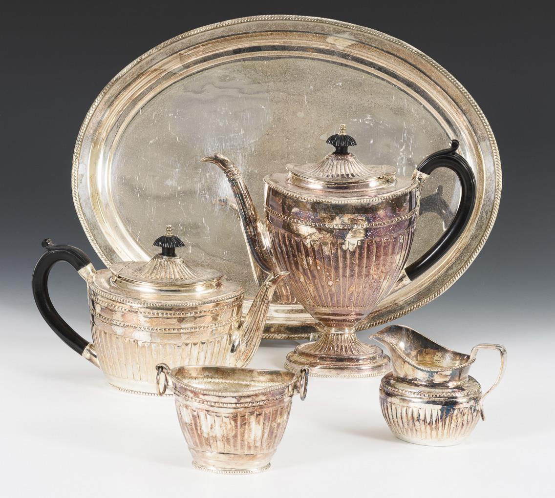 Teilgerippte Ovalform mit schwarzen Bakelit-Henkeln und -Knäufen: Kaffeekanne, Teekanne, Milchgießer, Zuckerschale und Zuckerlöffel, auf Tablett. Alters- und Gebrauchsspuren.