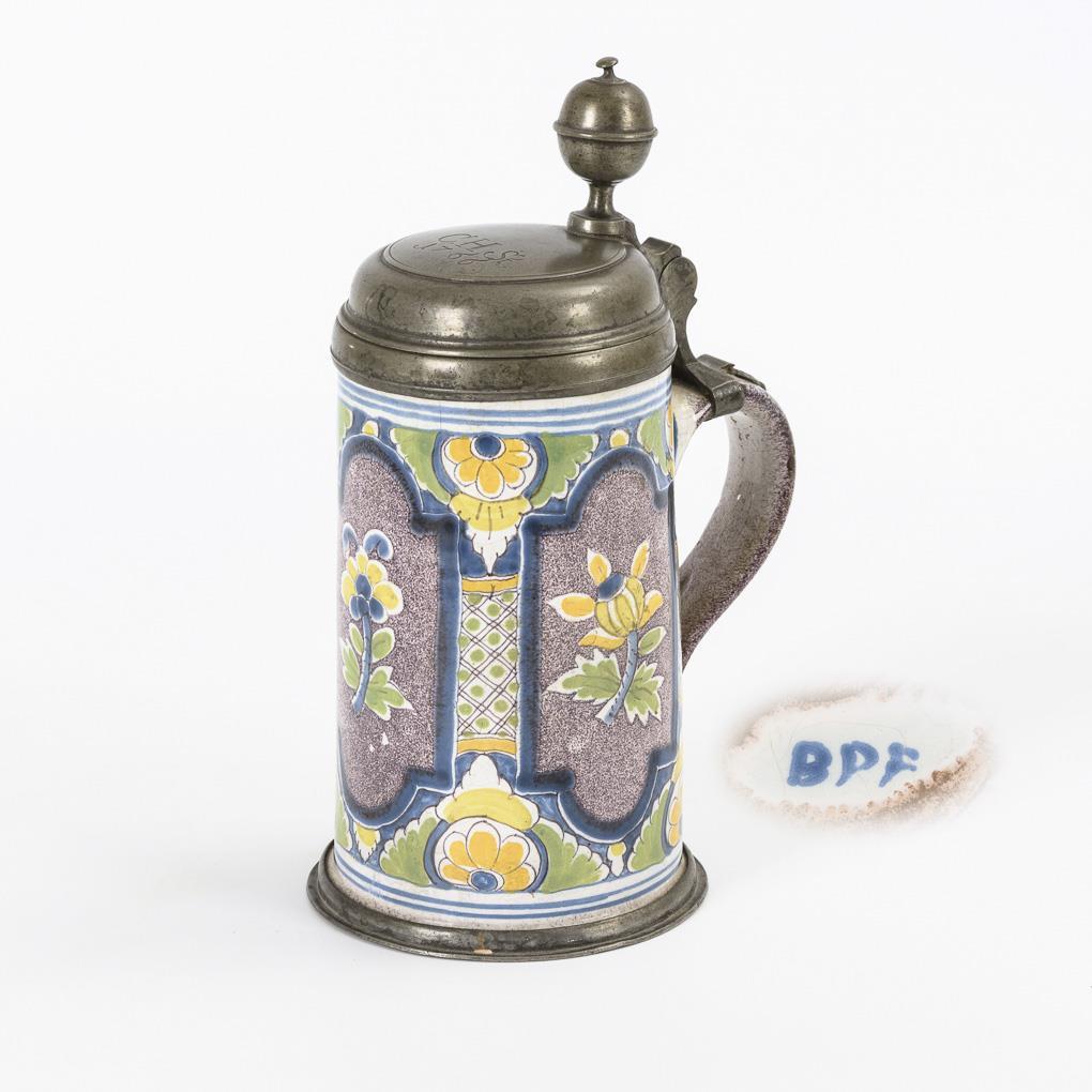 Zylinderkrug mit Bandhenkel. Farbiger Nischendekor auf manganjaspiertem Grund. Zinndeckel mit Kugeldrücker, graviert "CHS 1766", innen gepunzt (Johann Gottlob(?) Flach, Eibenstock), Zinnstandring. Wandungsrisse, Glasurbereibungen und minimale Chips.