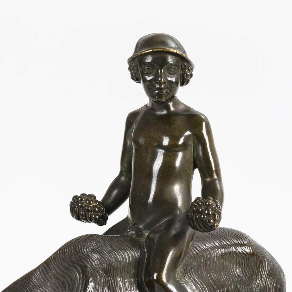 Nackt auf dem Ziegenbock reitender Knabe mit Trauben in den Händen. Patina etwas fleckig.