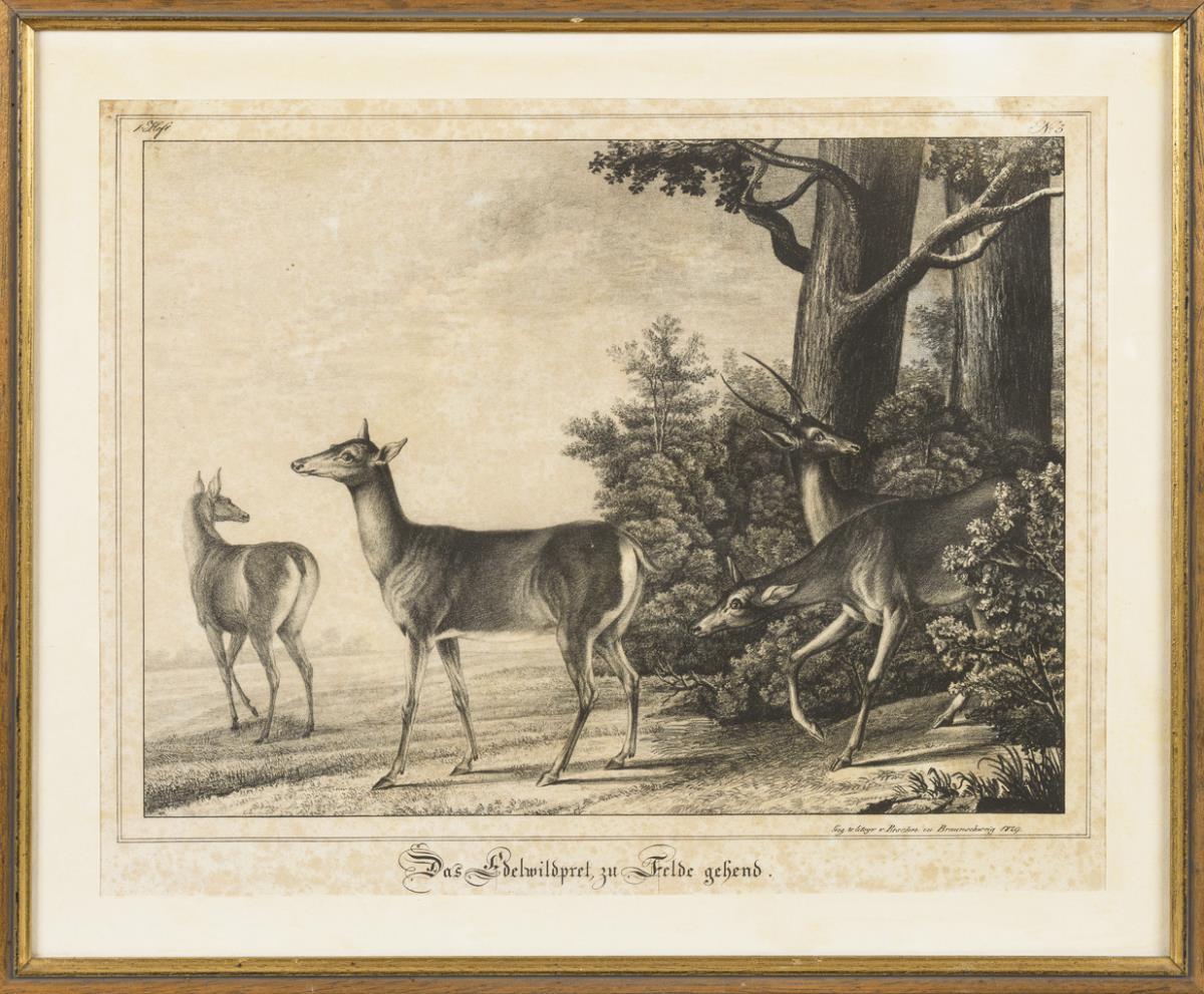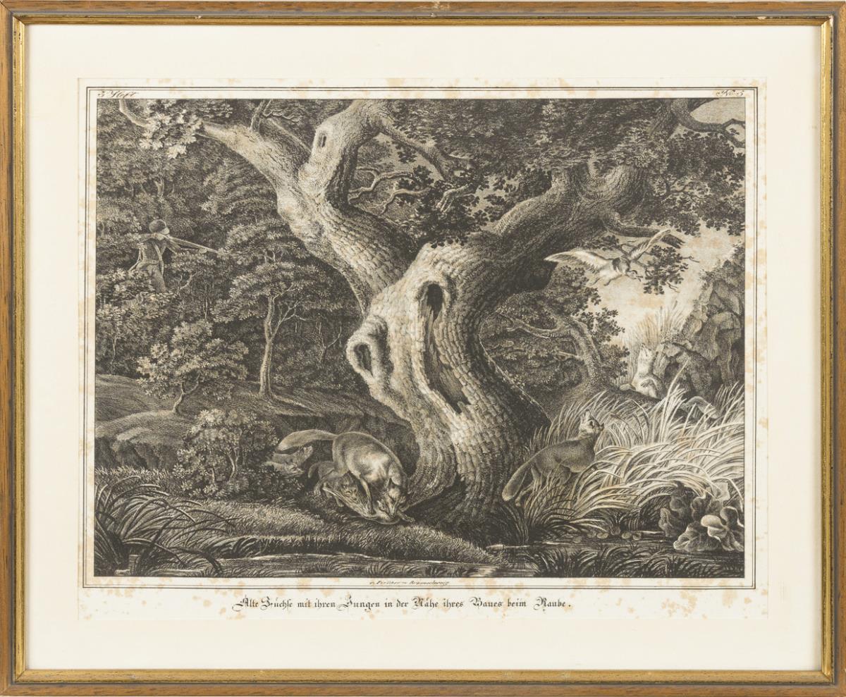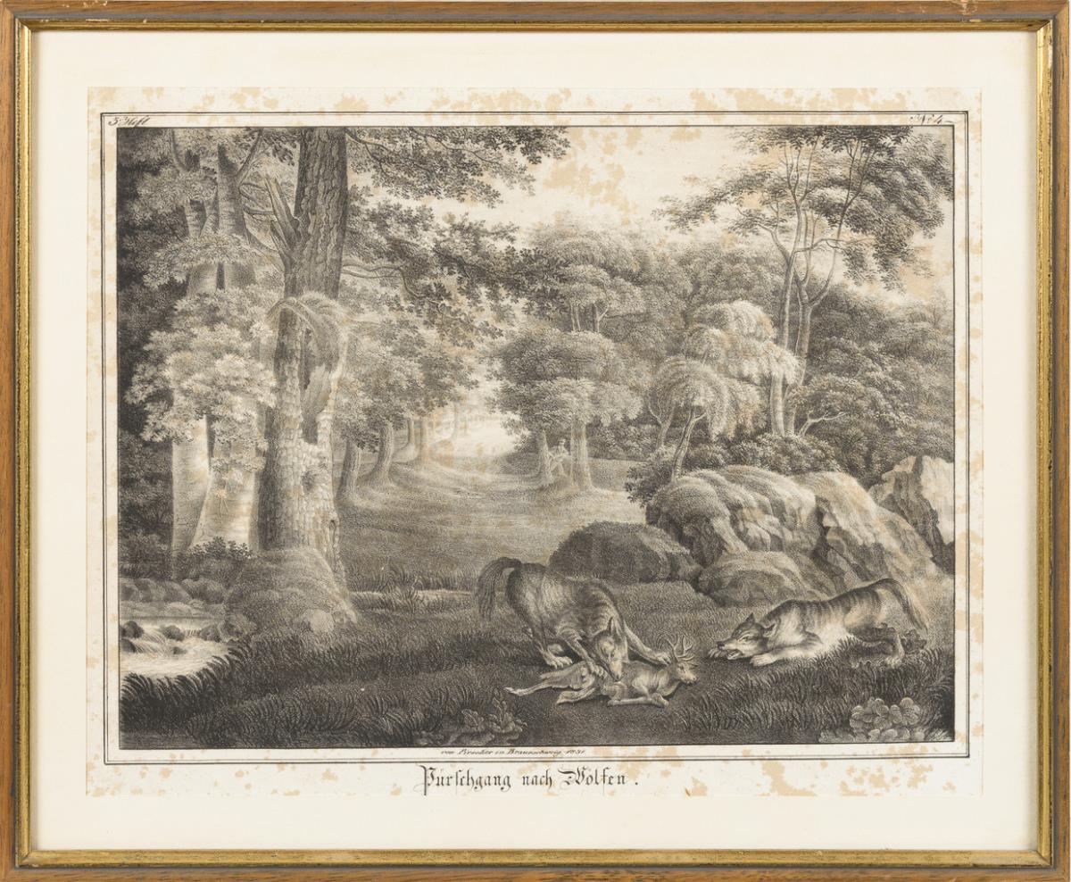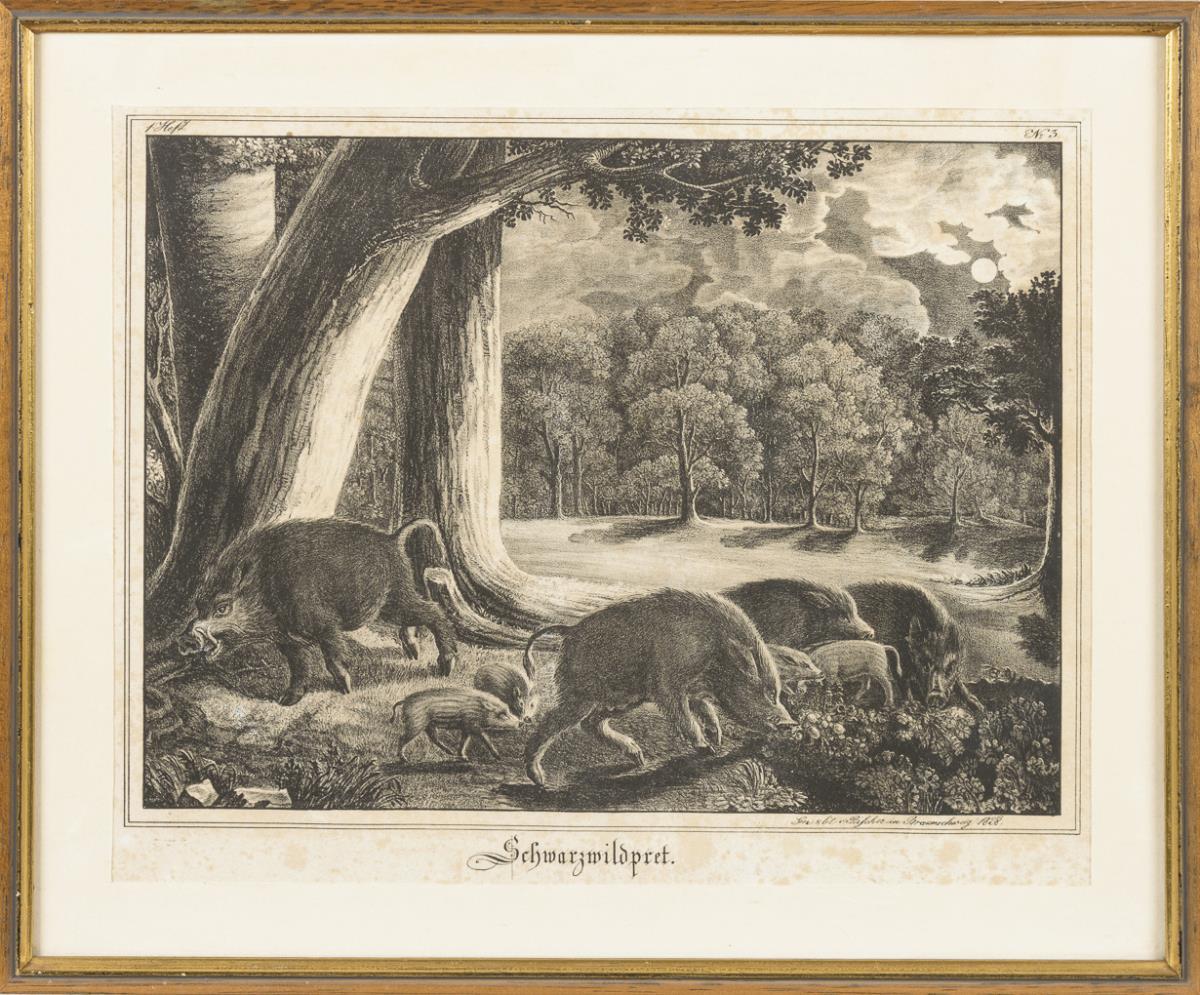 "Schwarzwildpret", "Alte Füchse mit ihren Jungen in der Nähe ihres Baues beim Raube", "Das Edelwildpret, zu Felde gehend", "Pürschgang nach Wölfen" und "Pürschgang nach Dammwildpret". Je stark stockfleckig.