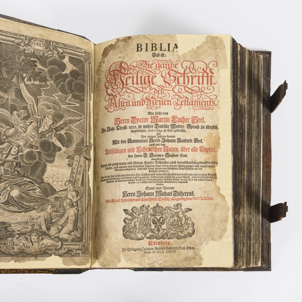 Titelkupfer, Titelblatt, Luther Kupferstich, (64), 1181, (7) Seiten mit zahlreichen Illustrationen. Geprägter Ledereinband mit Metallecken und jünger ergänzten Schließen. Titelkupfer und Titelblatt mit ganzseitiger Hinterklebung und Randverlust, weitere Blätter mit ordentlich gemachten Randhinterklebungen. Register und die Bilder der Kurfürsten fehlen, sowie hinten die Augsburger Konfession.